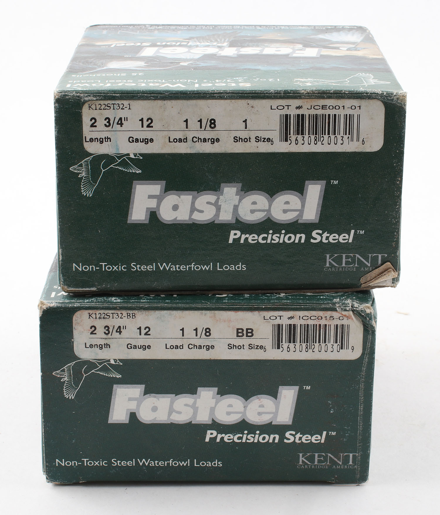 Lot of 2 Kent, 12ga., 1pc., Appears Full, shot size 1 & BB, multi-colored boxes. Grade: Very Good + - Value: 10 to 40