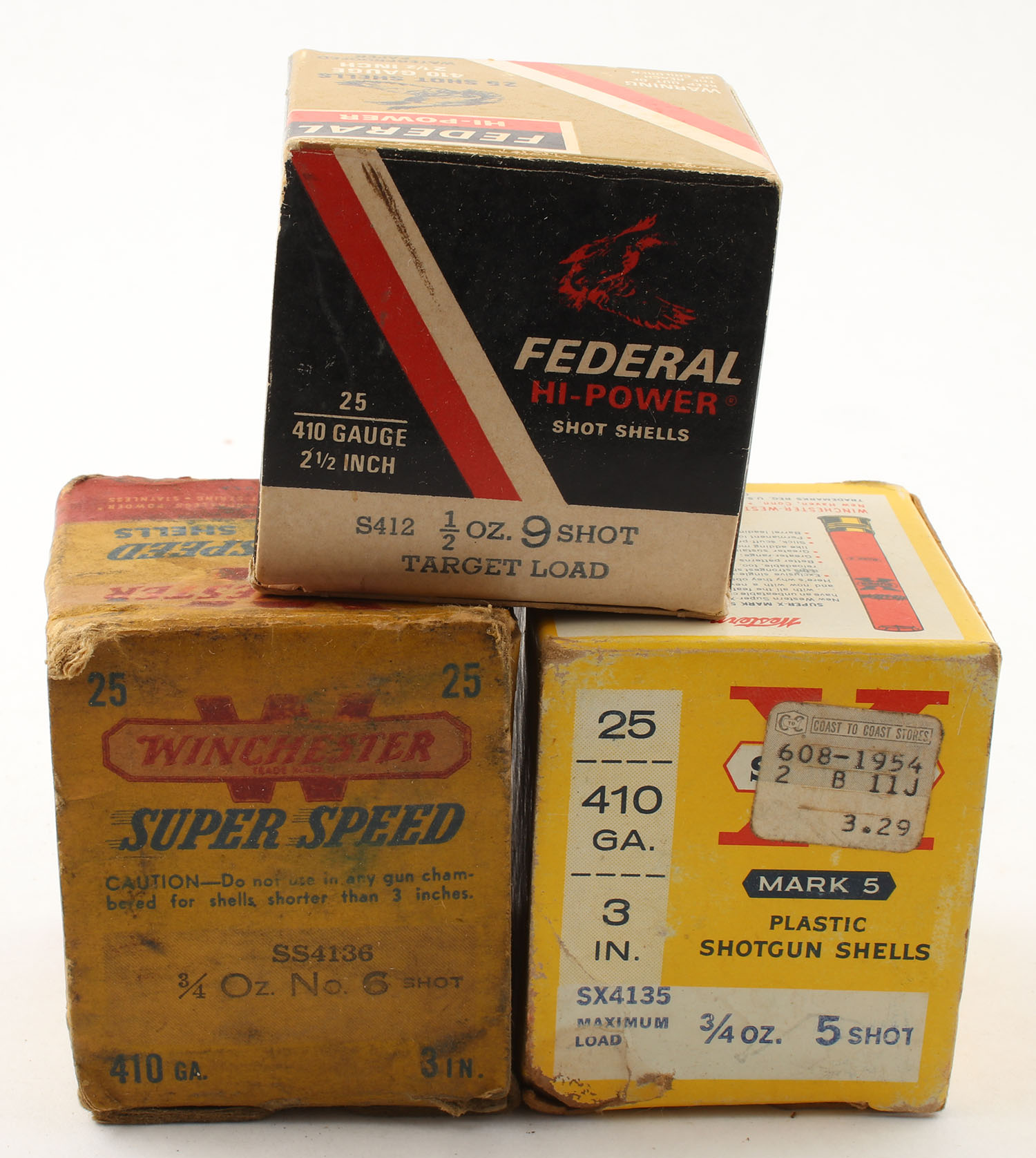 Lot of 3, Mixed Manufacture, 410ga., Appears Partial, shot size 5, 6 & 9, Shotshell boxes. Grade: Good ++ - Value: 10 to 30