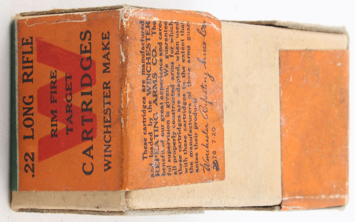 Winchester, Rim Fire Cartridges, .22 Long Rifle, Not in RR, Similar to RR: WRA-181 LR-68 (only not primed shells), 2pc. Buff box with green & orange wraparound label, box is solid with very good color, some age soiling, corners are mostly sharp, edges are crisp, label is intact. Grade: Very Good + - Value: 50 to 75