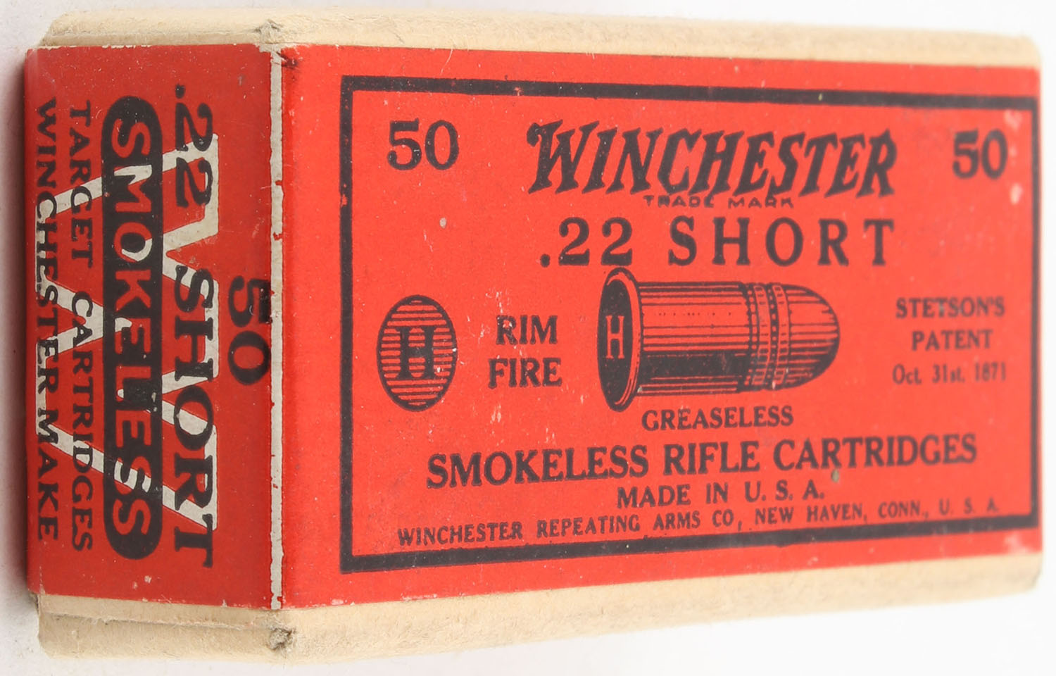 Winchester, Smokeless Rifle Cartridges, .22 Short, RR: WRA-177 S-62a, FULL & SEALED, 2pc. Buff box with red wraparound label, box is solid with minty color, front & bottom have been written on, corners are mostly sharp, edges are crisp, label is intact. Grade: Excellent - Value: 150 to 225