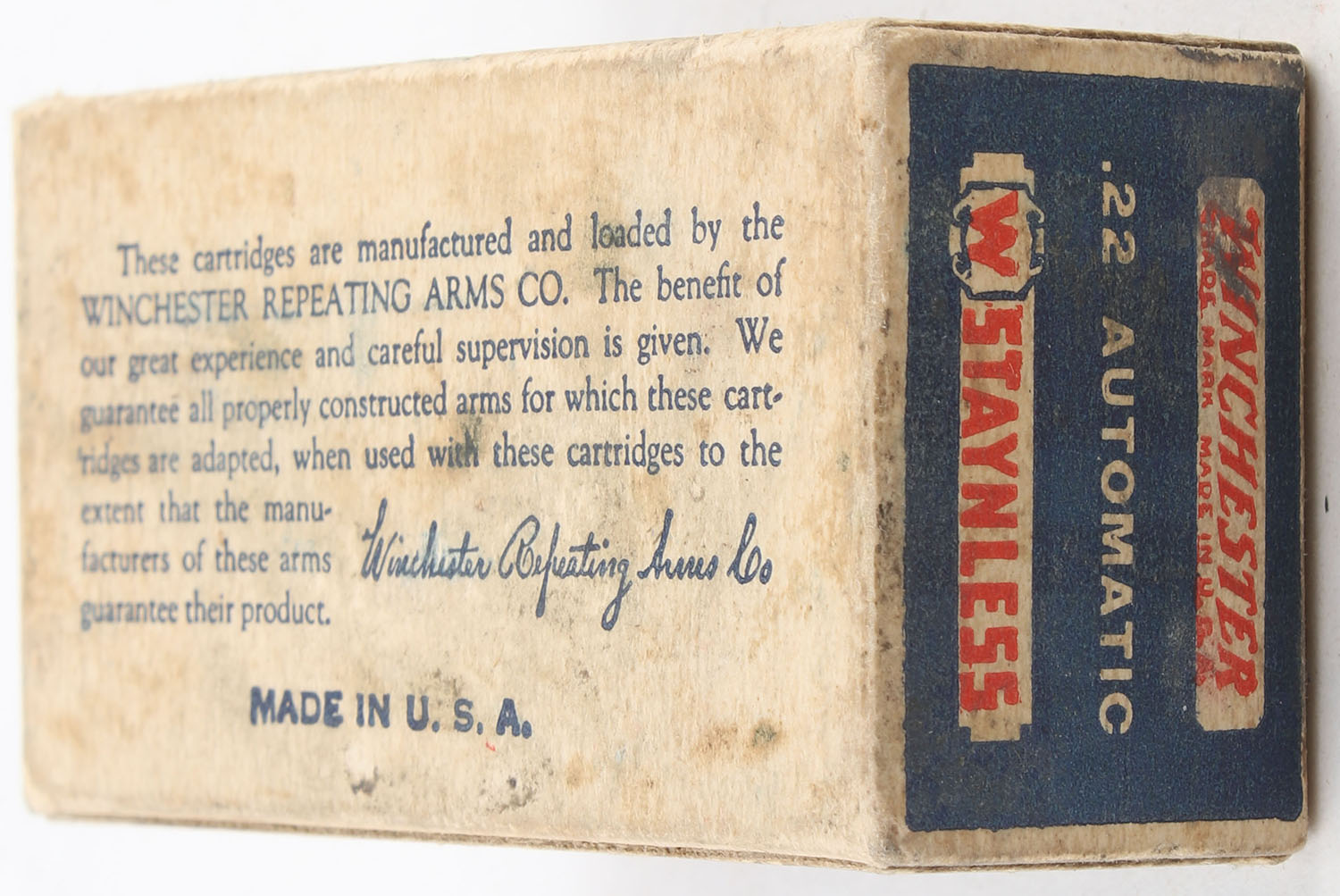 Winchester, Staynless, .22 Automatic, RHWeb: WRA-12B WA-1B, Full, 1pc. Blue white & red box, box is solid with very good to excellent color, minor age soiling & shelf wear, very minor corner wear, edges are mostly crisp, end flaps are solid, ammo is excellent. Grade: Excellent - Value: 50 to 75