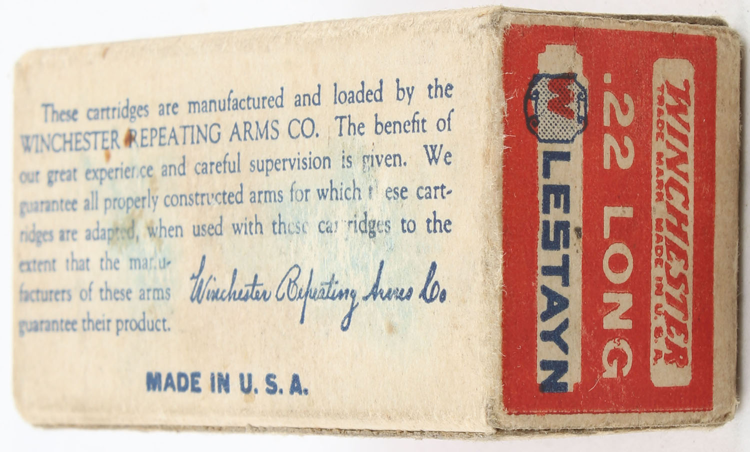 Winchester, Lestayn, .22 Long, RHWeb: WRA-13.5 L-1, Full, 1pc. Red white & blue box, box is solid with very good to excellent color, very minor age soiling & shelf wear, minor corner wear, edges are mostly crisp, end flaps are solid, ammo is very good. Grade: Very Good ++ - Value: 70 to 100