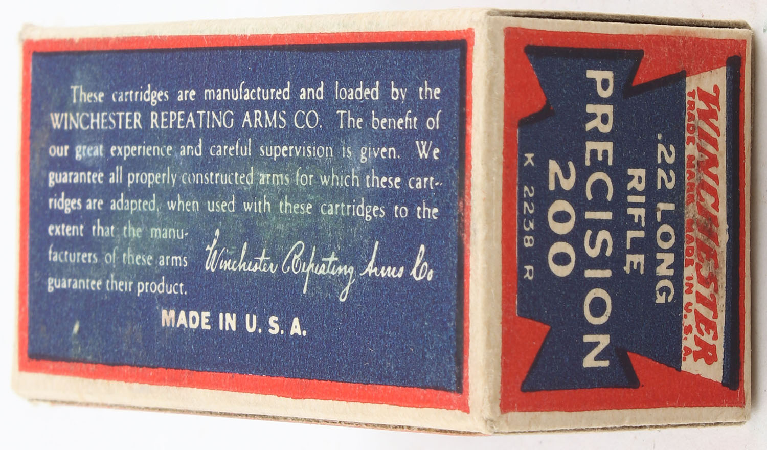 Winchester, Precision 200, .22 Long Rifle, RHWeb: WRA-53 LR-11e, Partial 47rds., 1pc. Blue red & white box, box is near mint with minty color, only very minor shelf wear on bottom, corners are sharp, edges are crisp, end flaps are solid, ammo is excellent. Grade: Excellent ++ - Value: 120 to 180