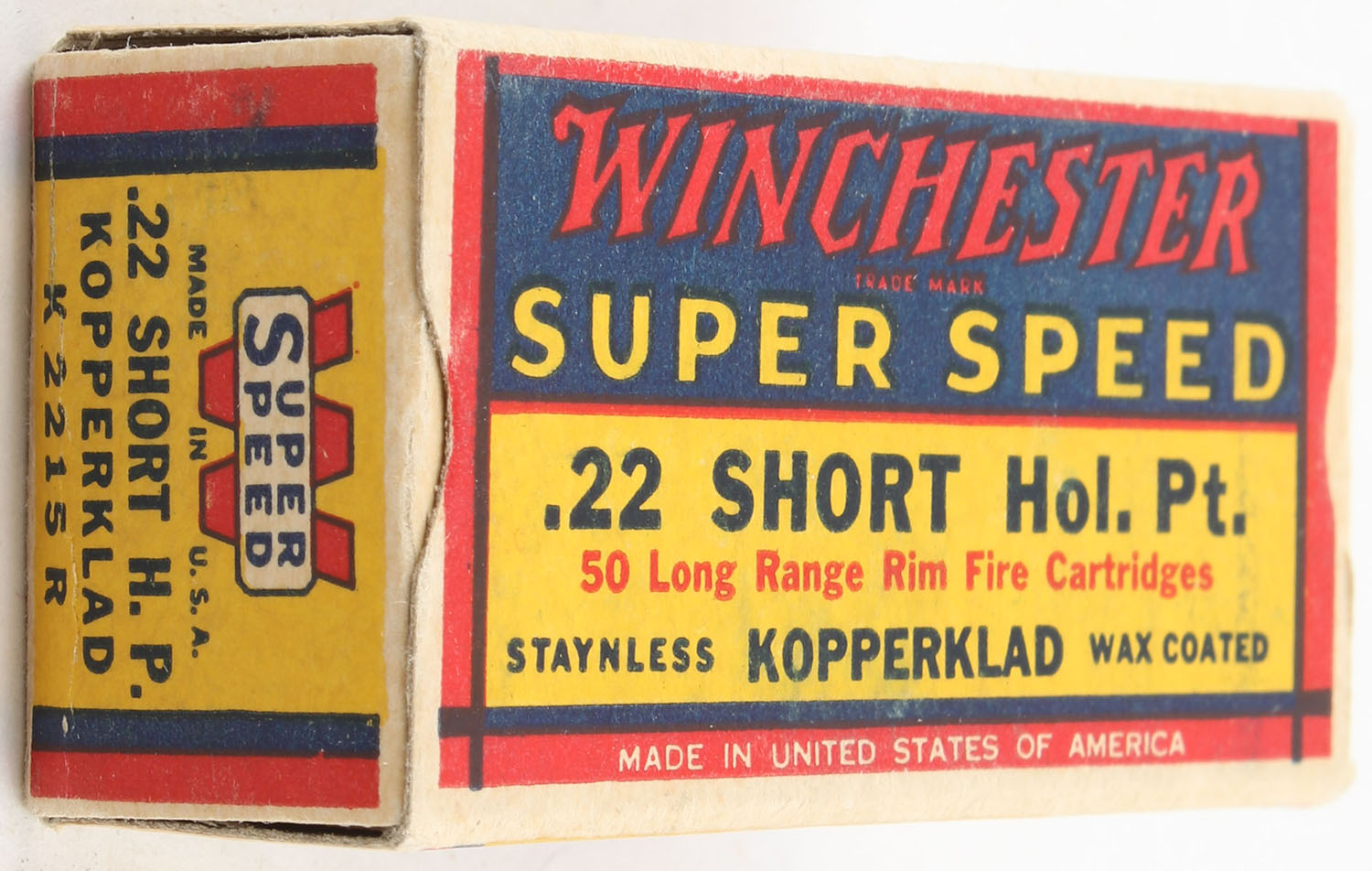 Winchester, Super Speed, .22 Short Hollow Point, RHWeb: WRA-15 S-2, Full, 1pc. Yellow blue & red box, box is solid with excellent color, very minor shelf wear, corners are mostly sharp, edges are crisp, end flaps are solid, ammo is excellent. Grade: Excellent ++ - Value: 30 to 45