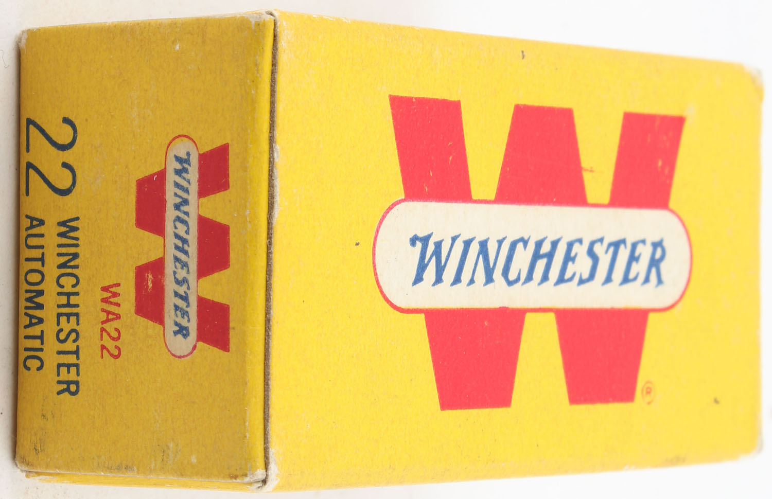 Winchester, W, .22 Winchester Automatic, RHWeb: WRA-19 WA-1b, Full, 1pc. Yellow red & white box, box is solid with excellent color, very minor age soiling & corner wear, edges are mostly crisp, end flaps are solid, ammo is excellent to minty. Grade: Excellent - Value: 24 to 36