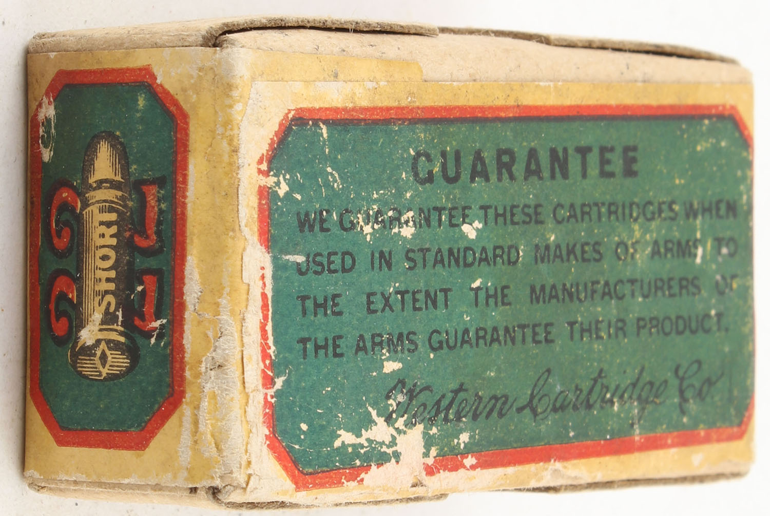 Western, Rim Fire Cartridges, .22 Short, Smokeless Powder, RHWeb: WCC-3 S-4a, FULL & SEALED, 2pc. Buff box with green & red wraparound label, box is solid with very good color, some shelf wear, minor age soiling, very minor edge & corner wear, label is intact. Grade: Very Good + - Value: 24 to 36