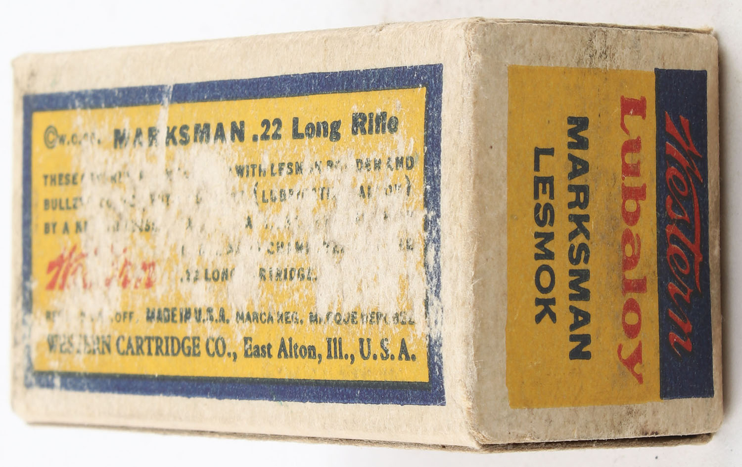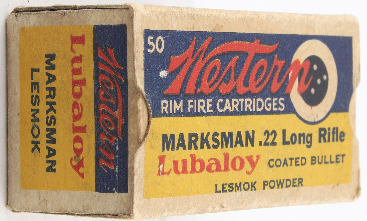 Western, Marksman, .22 Long Rifle, Lubaloy Coated Bullet, RHWeb: WCC-50 LR-8, Full, 1pc. Yellow blue & red bulls eye box, box is solid with very good color, some age soiling, shelf wear on bottom, minor edge & corner wear, end flaps are solid, ammo is excellent. Grade: Very Good + - Value: 30 to 45