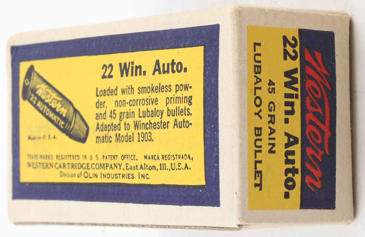 Western, Cartridges, .22 Winchester Automatic, 45 Grain Lubaloy Bullet, RHWeb: WCC-4.4 WA-3, Full, 1pc. Yellow blue & red bulls eye box, box is solid with excellent color, very minor age soiling & edge wear, corners are mostly sharp, edges are crisp, end flaps are solid, ammo is excellent to minty. Grade: Excellent + - Value: 50 to 75
