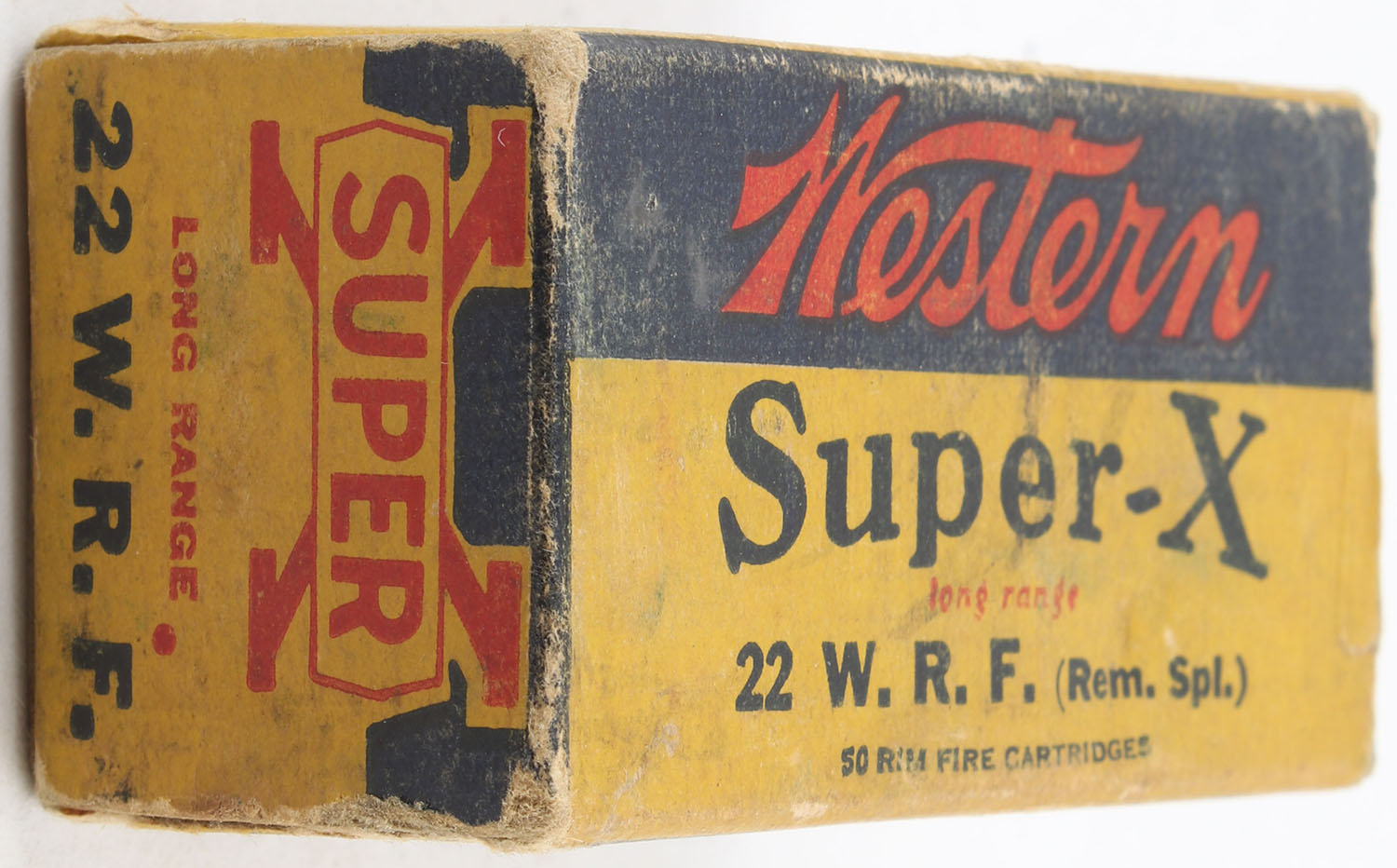 Western, Super-X, .22 W.R.F. (Rem. Spl.), RHWeb: WCC-Super-X-WRF WRF-13, Partial 47rds., 1pc. Yellow blue & red box, box is solid with good color, age soiling, some shelf wear, corner wear, minor edge wear, end flaps are solid, ammo is excellent. Grade: Very Good - Value: 16 to 24