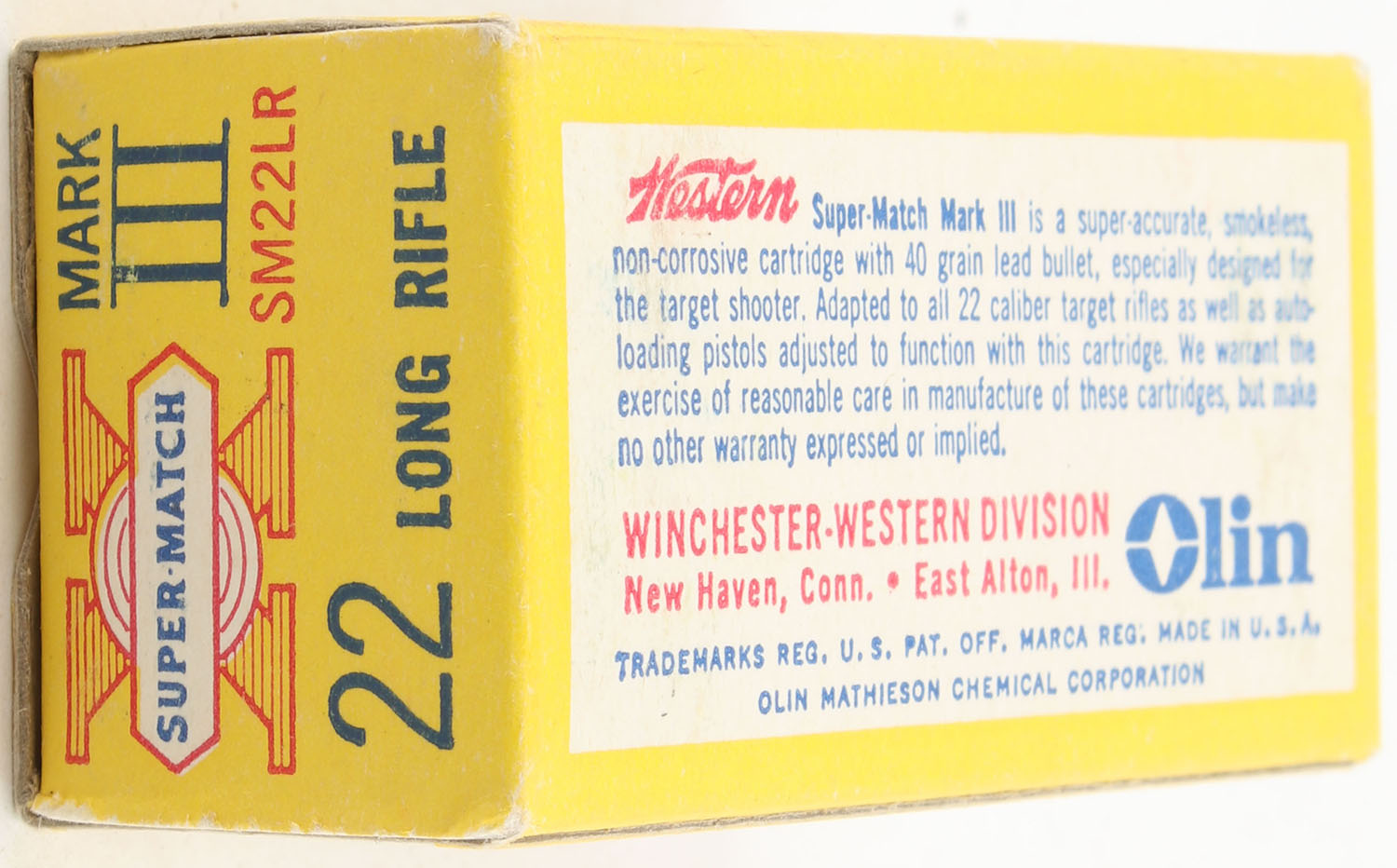 Western, Super-Match Mark III, .22 Long Rifle, RHWeb: WCC-51.3 LR-2b, Full, 1pc. Yellow red & white box, box is solid with excellent color, very minor edge & corner wear, end flaps are solid, ammo is excellent. Grade: Excellent + - Value: 8 to 12