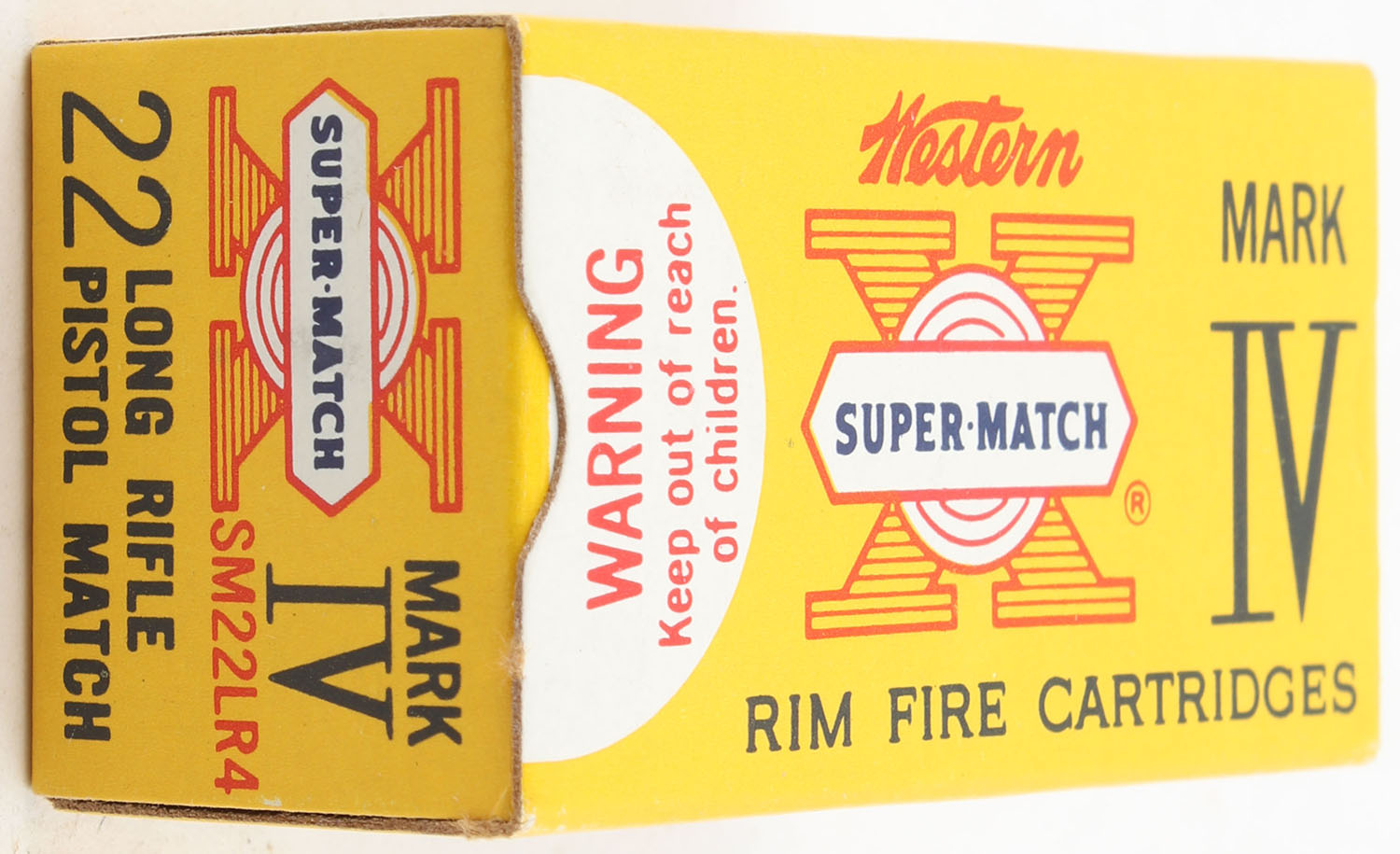 Western, Super-Match Mark IV, .22 Long Rifle, Pistol Match, RHWeb: WCC-51.4 LR-2e, Full, 1pc. Yellow red & white box, box is MINT with minty color, corners are sharp, edges are crisp, end flaps are solid, ammo is minty. Grade: MINT - Value: 10 to 15