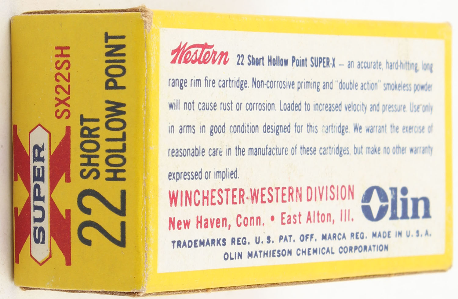 Western, Super X, .22 Short Hollow Point, 27 Grain Lubaloy Coated Bullet, Full, 1pc. Yellow red & white box, box is solid with minty color, very minor corner wear, edges are crisp, end flaps are solid, ammo is excellent. Grade: Excellent + - Value: 8 to 16