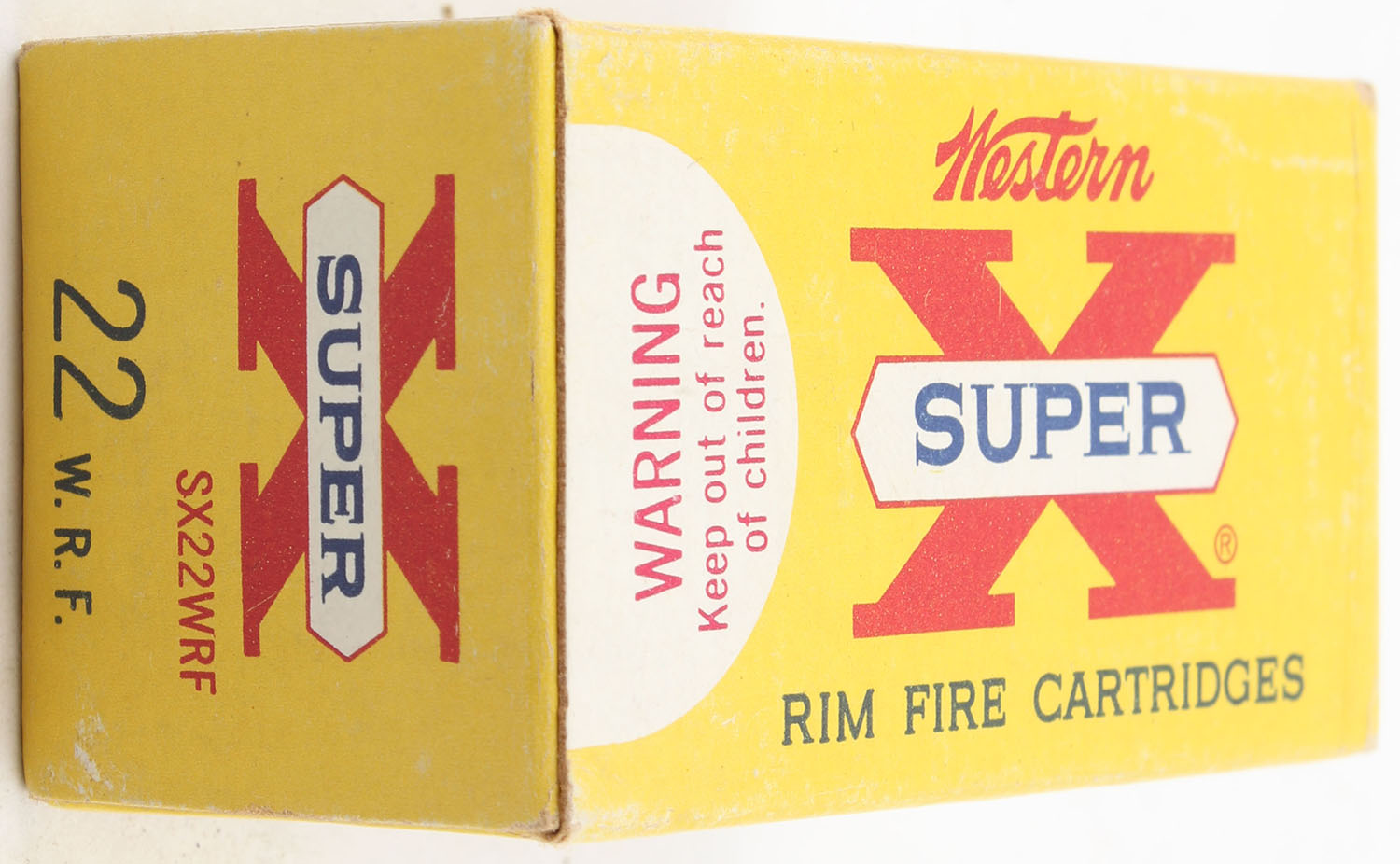Western, Super X, .22 W.R.F., 45 Grain Lubaloy Coated Bullet, RHWeb: WCC-12 WRF-1b, Full, 1pc. Yellow red & white box, box is solid with excellent color, very minor edge & corner wear, end flaps are solid, ammo is excellent. Grade: Excellent + - Value: 12 to 18