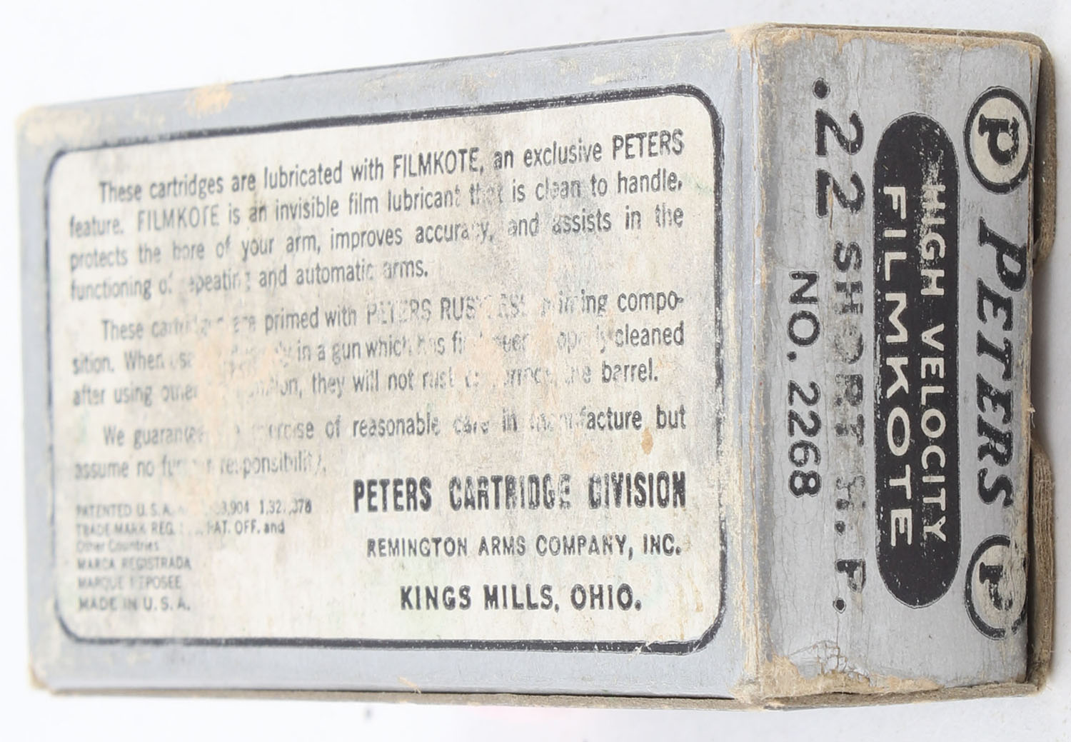 Peters, High Velocity Filmkote, .22 Short Hollow Point, RHWeb: PCC-13 S-3g, Partial 34rds. 1pc. Silver & black box, box is solid with very good color, some shelf wear, some edge & corner wear, end flaps are solid, ammo is excellent. Grade: Very Good - Value: 10 to 15
