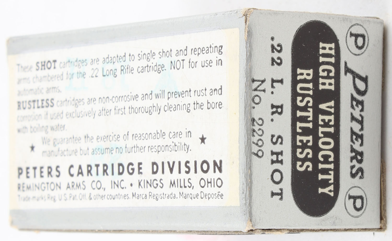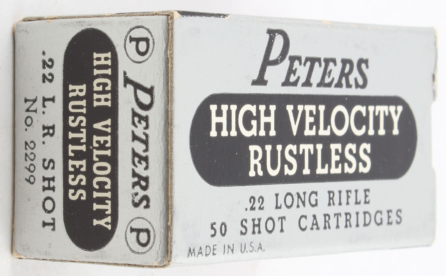 Peters, High Velocity Rustless, .22 Long Rifle Shot, RHWeb: PCC-14 LR-3, Full, 1pc. Silver & black box, box is near mint with minty color, only very minor corner wear, edges are crisp, end flaps are solid, ammo is excellent. Grade: Excellent ++ - Value: 60 to 90