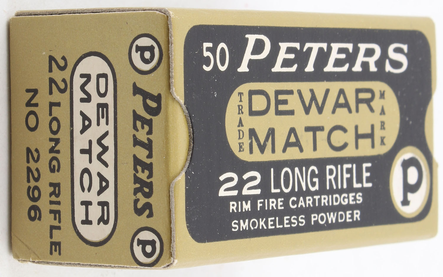 Peters, Dewar Match, .22 Long Rifle, RHWeb: PCC-53B LR-2c, Full, 1pc black & gold box, box is near mint with minty color, only very minor corner wear on bottom front corner, corners otherwise sharp, edges are crisp, end flaps are solid, ammo is excellent. Grade: Excellent ++ - Value: 40 to 150