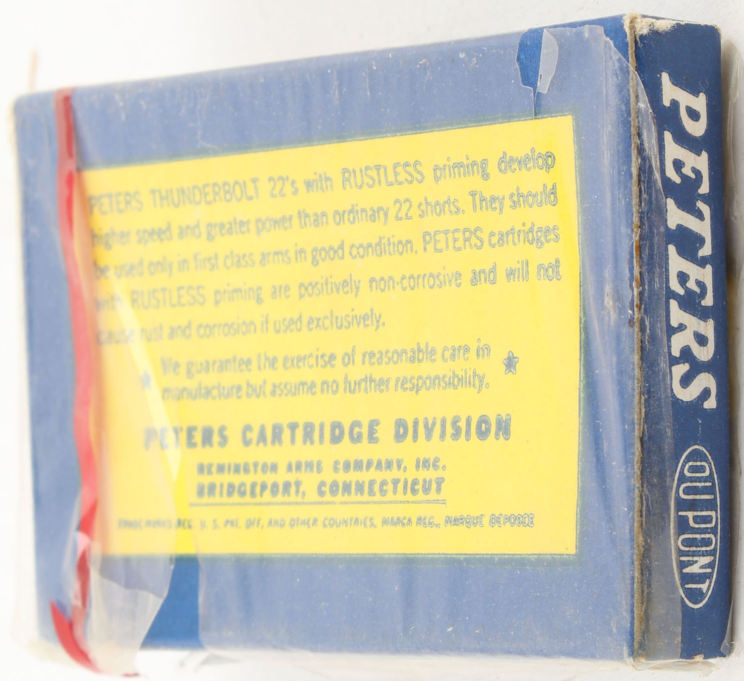 Peters, ''Thunderbolt'', .22 Short, RHWeb: PCC-17 S-5, Full, 1pc. Blue yellow & white flat pack, pack is solid with minty color, minor corner wear, edges are crisp, end flaps are solid, cellophane wrap is 90% intact, ammo appears minty. Grade: Excellent - Value: 40 to 60