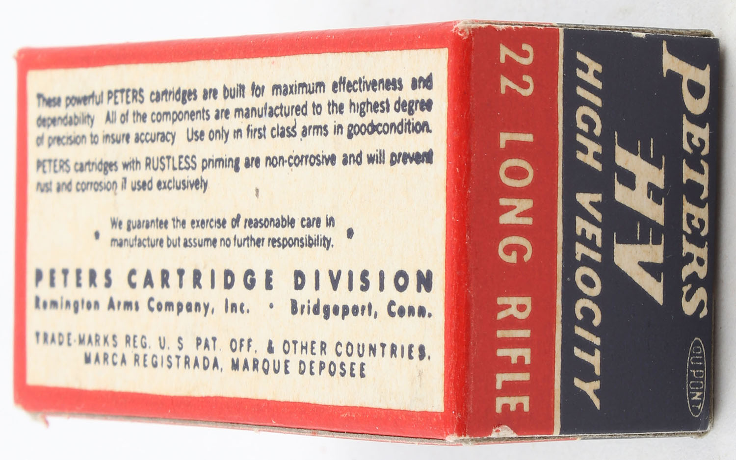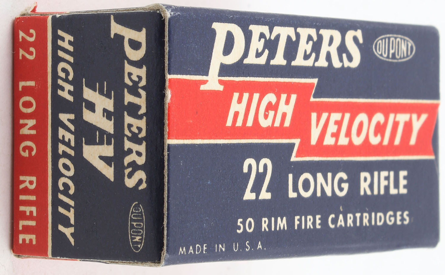 Peters, High Velocity, .22 Long Rifle, RHWeb: PCC-17 LR-1ed, Full, 1pc. Blue red & white box, box is solid with excellent to minty color, ding on top front edge, corners are mostly sharp, edges are crisp, end flaps are solid, ammo is minty. Grade: Excellent ++ - Value: 16 to 24