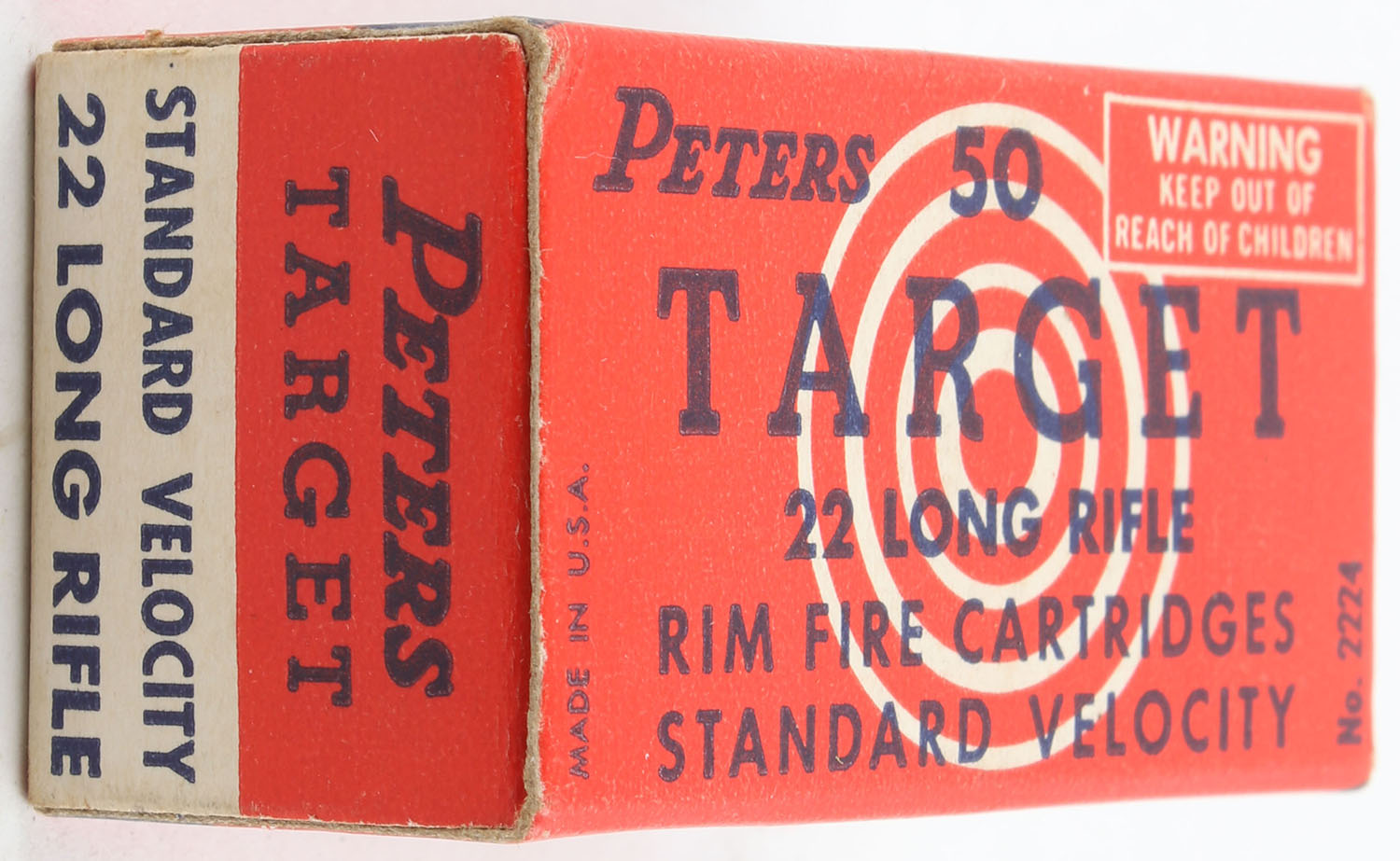 Peters, Target, .22 Long Rifle, Standard Velocity, RHWeb: PCC-54D LR-4, Full, 1pc. Red black & white box, box is near mint with minty color, only very minor corner wear, edges are crisp, end flaps are solid, ammo is minty. Grade: Excellent ++ - Value: 6 to 12