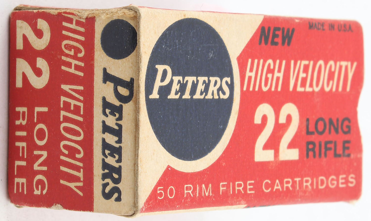 Peters, New High Velocity, .22 Long Rifle, RHWeb: PCC-18 LR-1, Full, 1pc. Red white & blue box, box is solid with very good color, minor age soiling & corner wear, very minor edge wear, end flaps are solid, ammo is excellent. Grade: Excellent - Value: 8 to 12