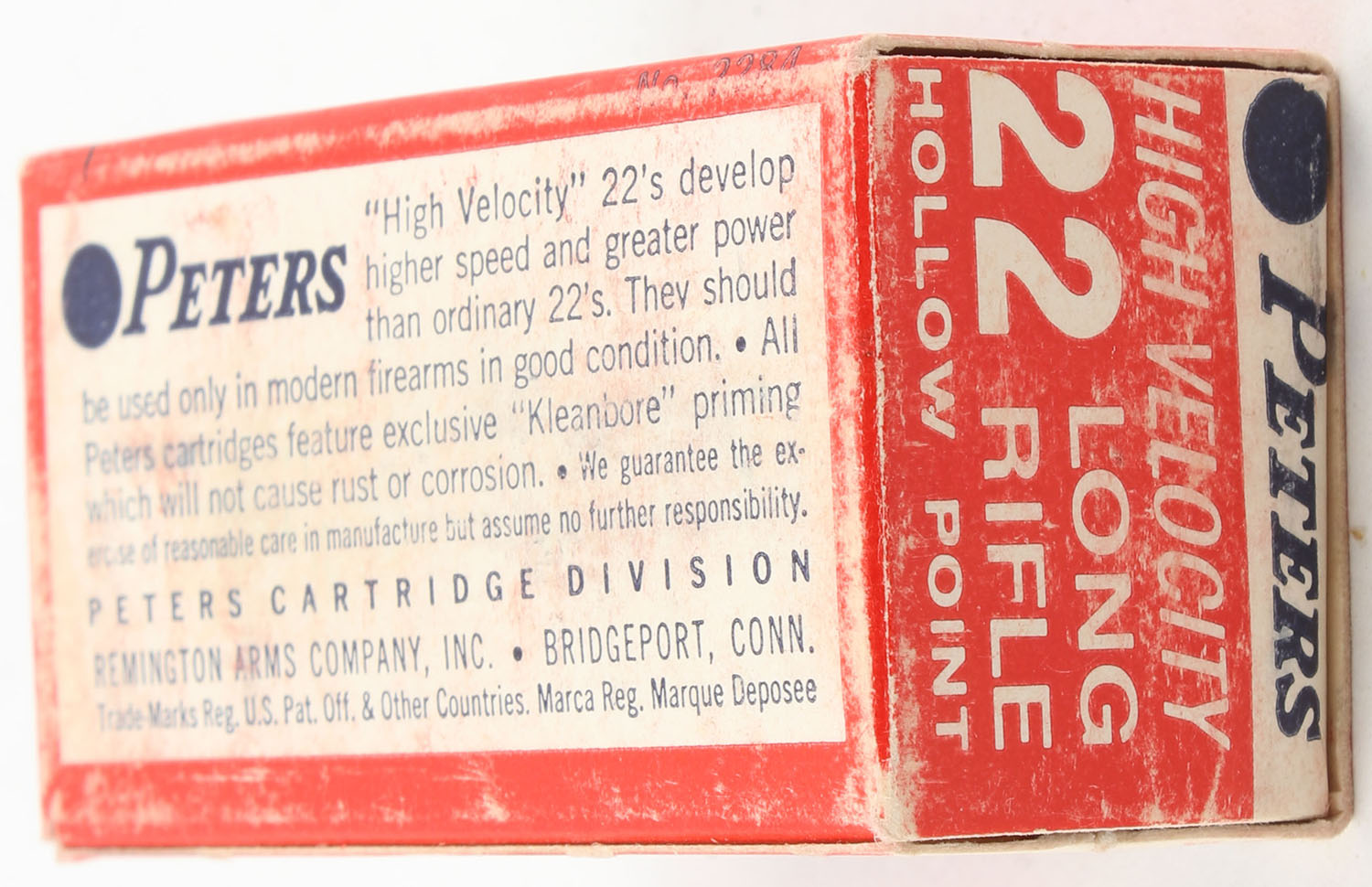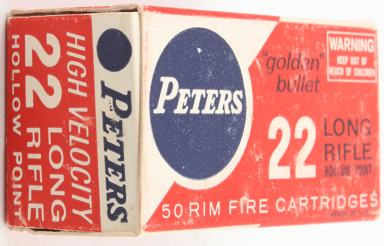 Peters, ''golden'' bullet, .22 Long Rifle Hollow Point, RHWeb: PCC-20 LR-2b, Partial 49rds., 1pc. Red white & blue box, box is solid with excellent color, some shelf wear, minor corner wear, edges are crisp, end flaps are solid, ammo is excellent to minty. Grade: Excellent - Value: 10 to 15