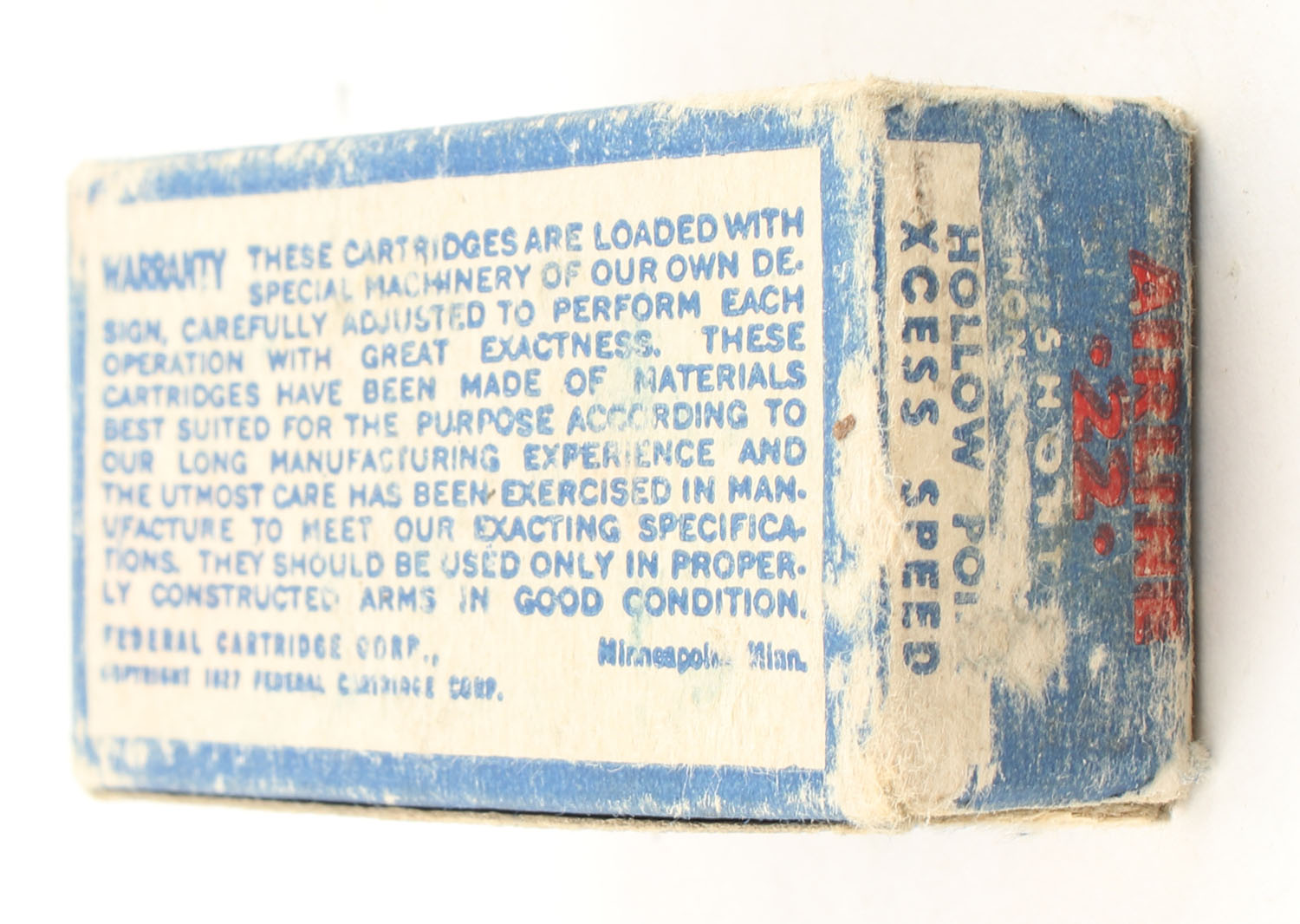 Federal, Airline, .22 Short Hollow Point, Lead Lubricated, RHWeb: FCC-4.3 S-10, Full, 1pc. Blue white & red box, box is solid with very good color, shelf wear, some edge & corner wear, end flaps are solid, ammo is very good. Grade: Very Good + - Value: 24 to 36