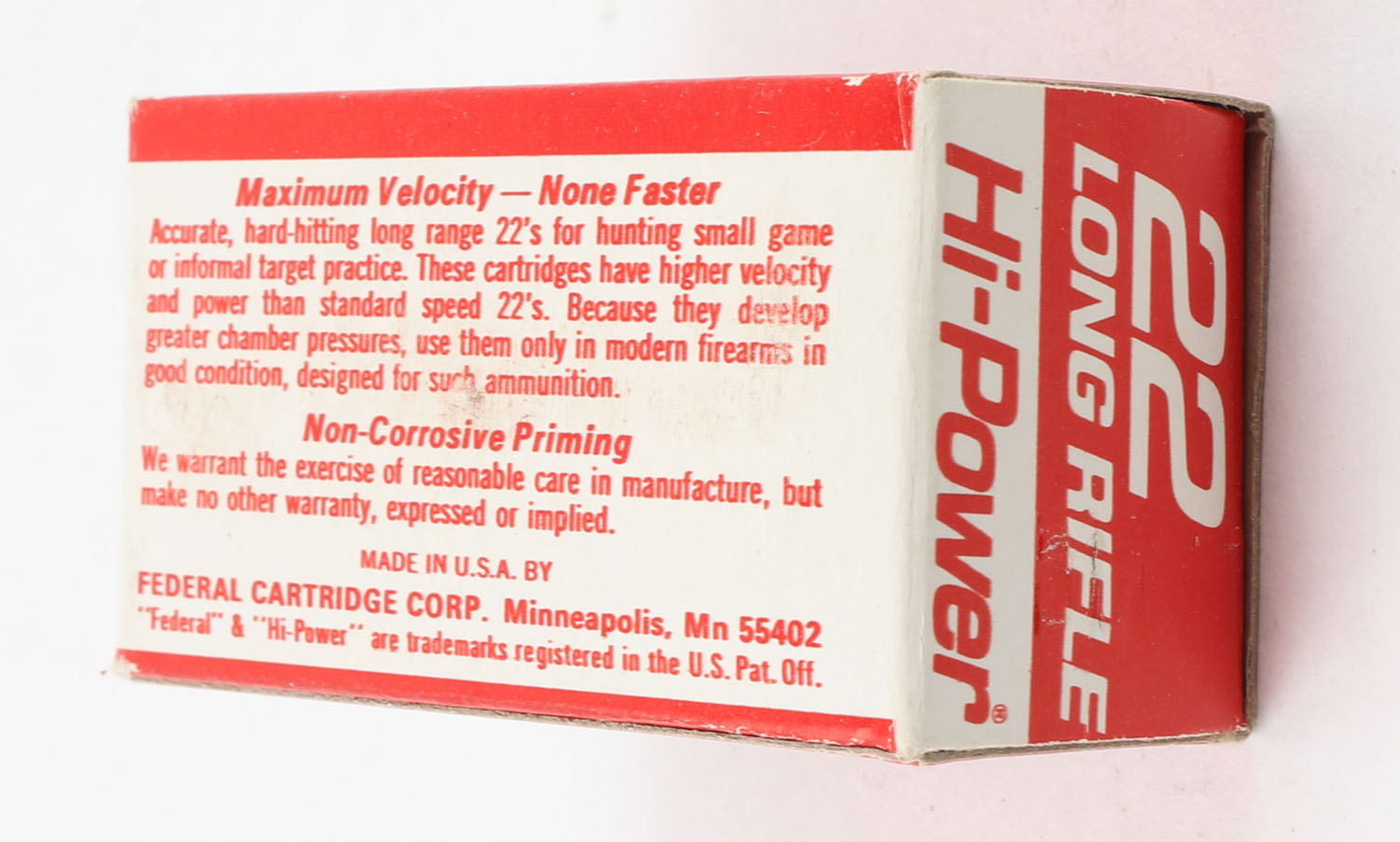 Federal, Hi-Power, .22 Long Rifle, Maximum Velocity, RHWeb: FED-10 LR-2a, Full, 1pc. Red & white box, box is solid with minty color, very minor corner wear, edges are mostly crisp, end flaps are solid, ammo is minty. Grade: Excellent + - Value: 10 to 15
