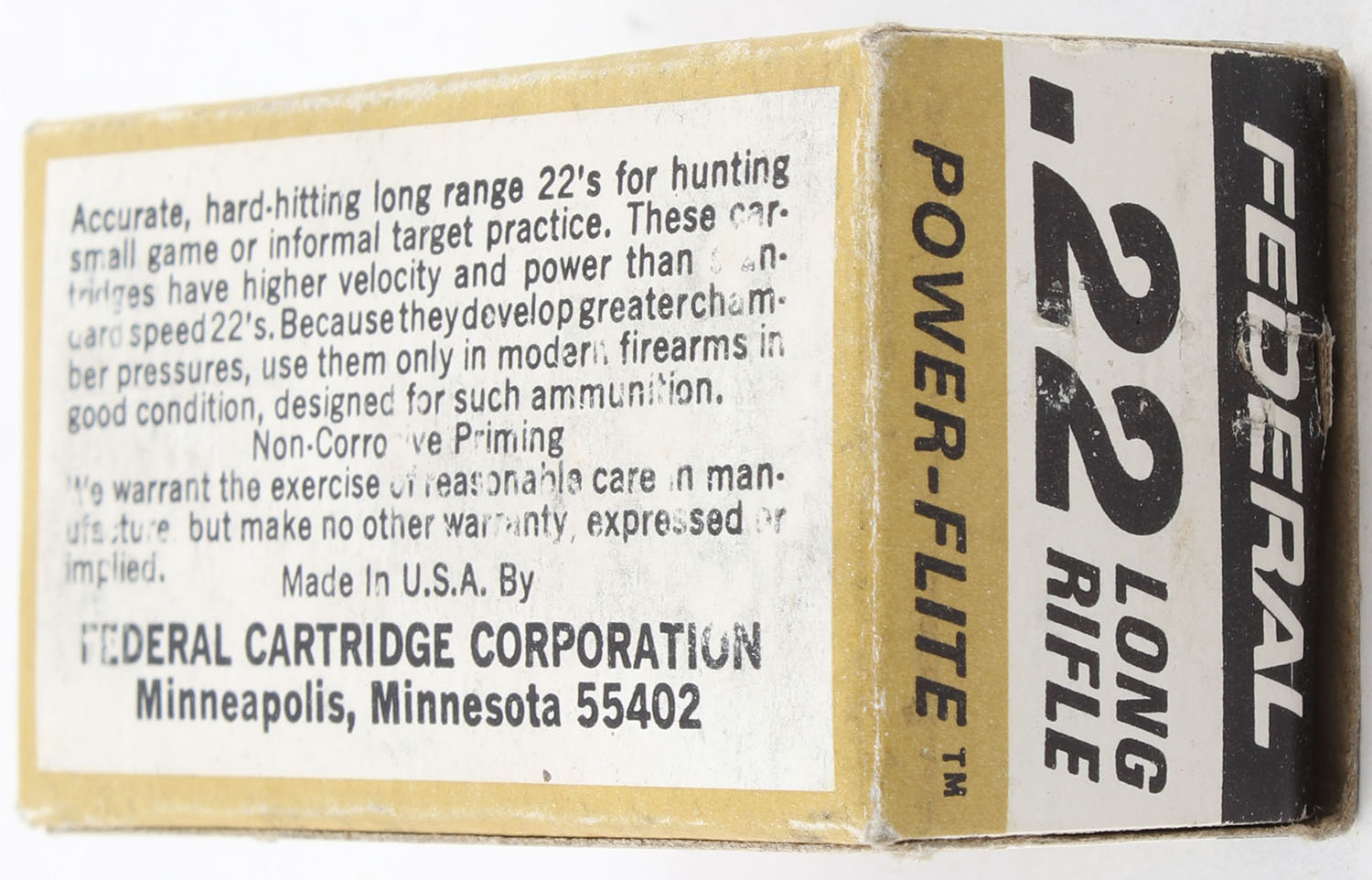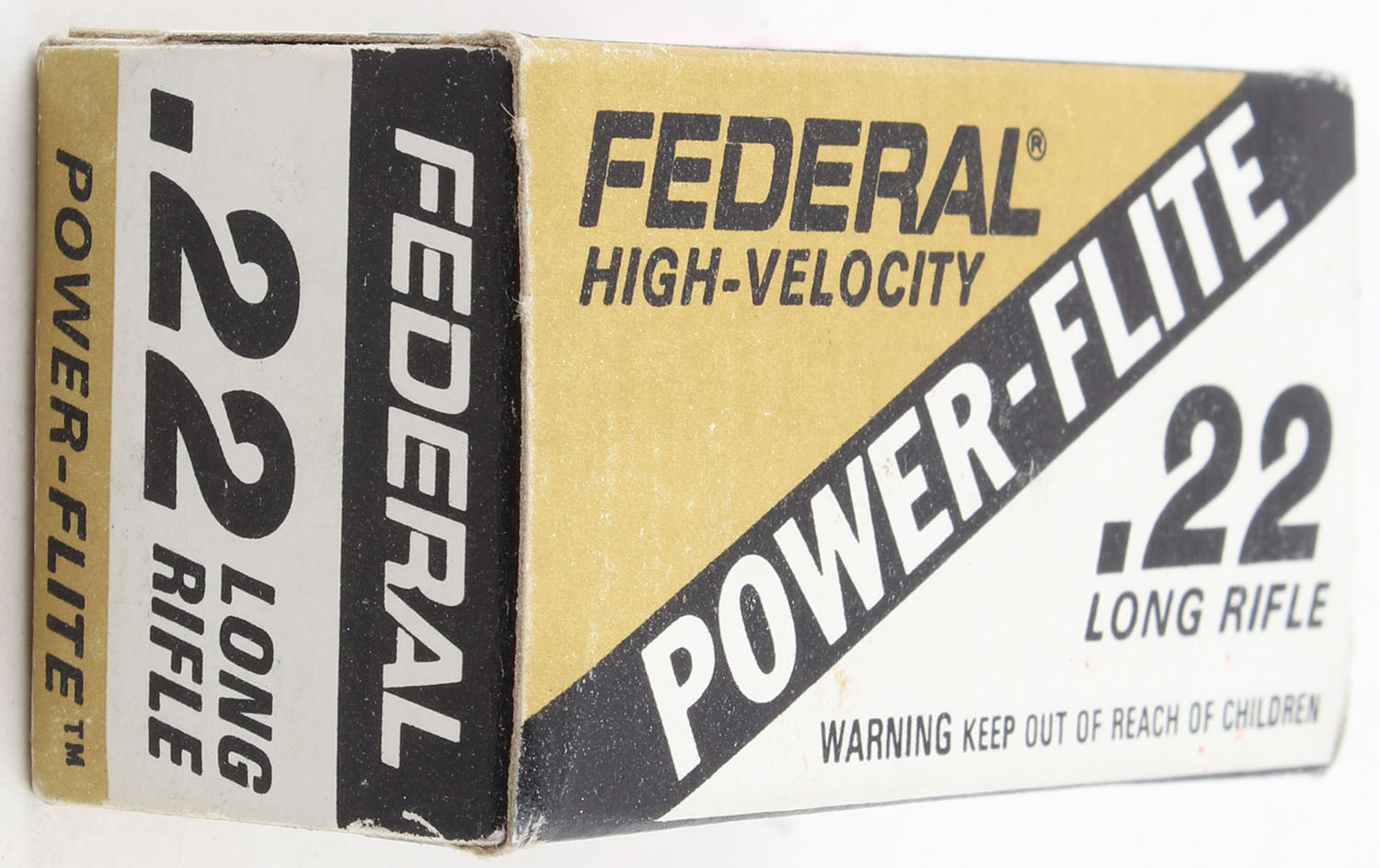 Federal, Power-Flite, .22 Long Rifle, High-Velocity, RHWeb: FED-12 LR-1b, Full, 1pc. White black & gold box, box is solid with excellent to minty color, very minor corner wear, edges are crisp, end flaps are solid, ammo is minty. Grade: Excellent + - Value: 8 to 12