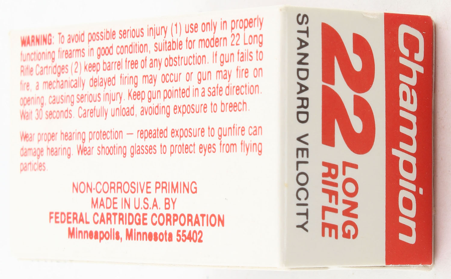 Federal, Champion, .22 Long Rifle, Standard Velocity, RHWeb: FED-14 LR-1a, Full, 1pc. White red & black box, box is MINT with minty color, corners are sharp, edges are crisp, end flaps are solid, ammo is excellent. Grade: MINT - Value: 6 to 10