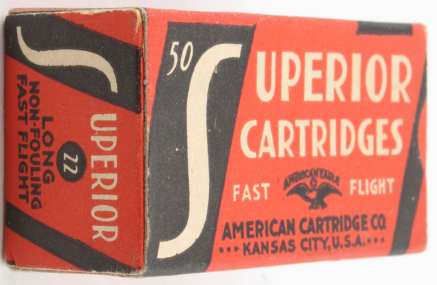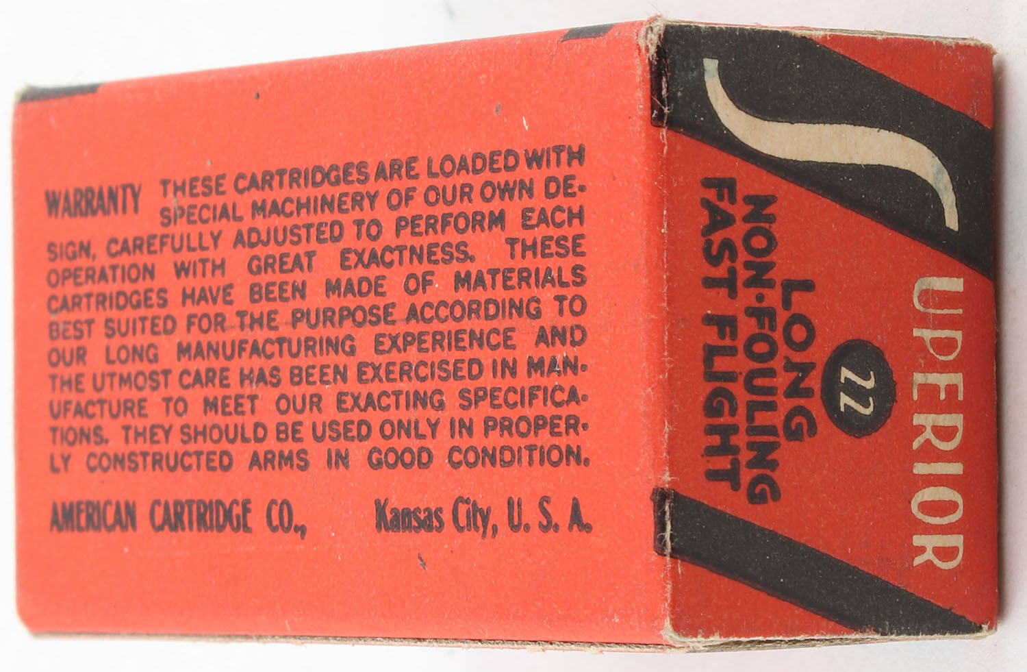American, Superior Cartridges, .22 Long, Fast Flight, RHWeb: ACC-2 L-1b, Full, 1pc. Red black & white box, box is solid with excellent color, very minor age soiling, corners are mostly sharp, edges are crisp, end flaps are solid, ammo is excellent to minty. Grade: Excellent ++ - Value: 30 to 45
