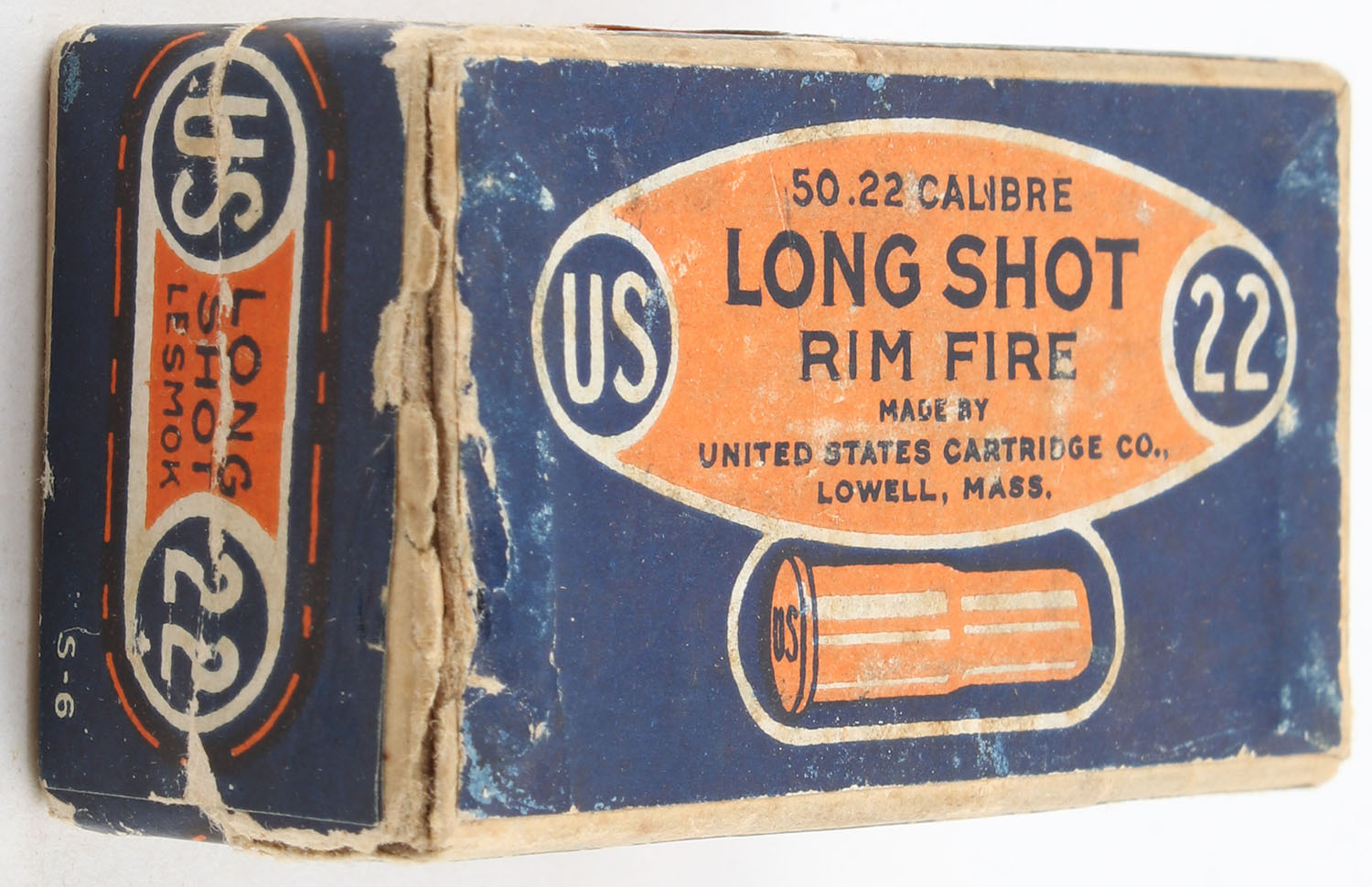 U.S., Rim Fire, .22 Long Shot, Lesmok, RHWeb: US-7 L-1a, full, 2pc. Buff box with blue & orange top & side sealing labels, box is solid with excellent color, very minor color fading, seam split to top left edge, vertical seam split to front right corner, some edge & corner wear, labels are intact, ammo is excellent. Grade: Very Good + - Value: 40 to 60