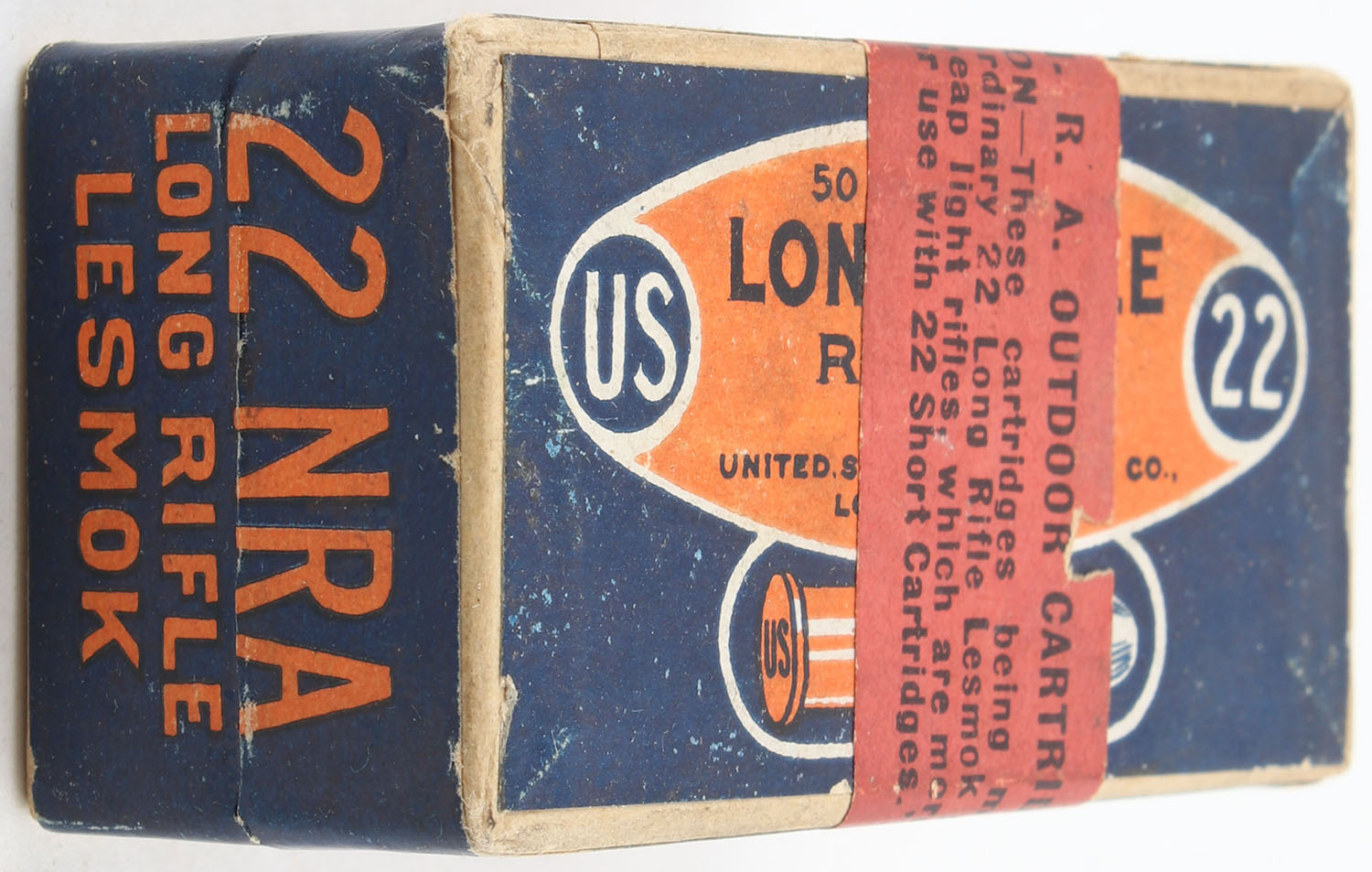 U.S., NRA, .22 Long Rifle, Lesmok, RHWeb: US-51 LR-3a, FULL & SEALED, 2pc. Buff box with blue/orange top & side sealing labels, box is solid with excellent color, very minor edge & corner wear, labels are intact. Grade: Excellent ++ - Value: 20 to 30