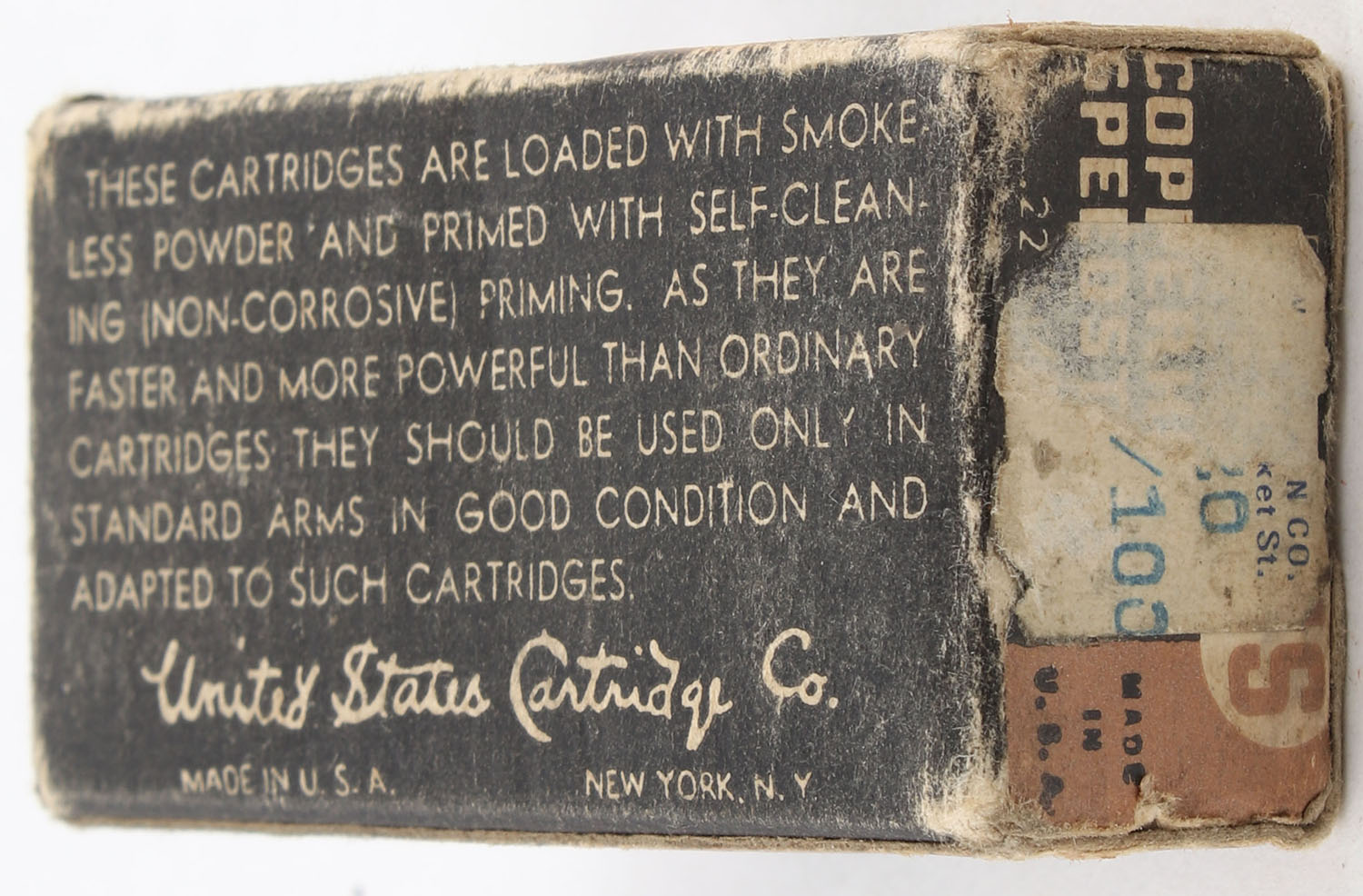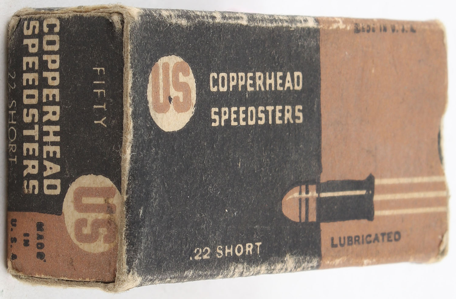 U.S., Copperhead Speedsters, .22 Short, Lubricated, RHWeb: US-13 S-2e, Full, 1pc. Black & brown box, box is solid with very good color, minor age soiling, minor edge & corner wear, end flaps are solid, ammo is excellent. Grade: Very Good ++ - Value: 10 to 15