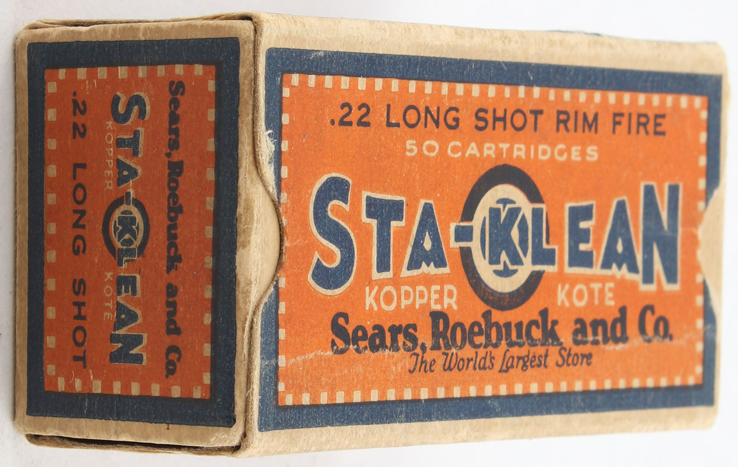 Sears, Sta-Klean, .22 Long Shot, Kopper Kote, RHWeb: SEARS-3 L-2, Partial 8rds., 1pc. Orange blue & buff box, box is solid with very good to excellent color, minor age soiling, very minor corner wear, edges are crisp, end flaps are solid, ammo is excellent. Grade: Excellent - Value: 10 to 15