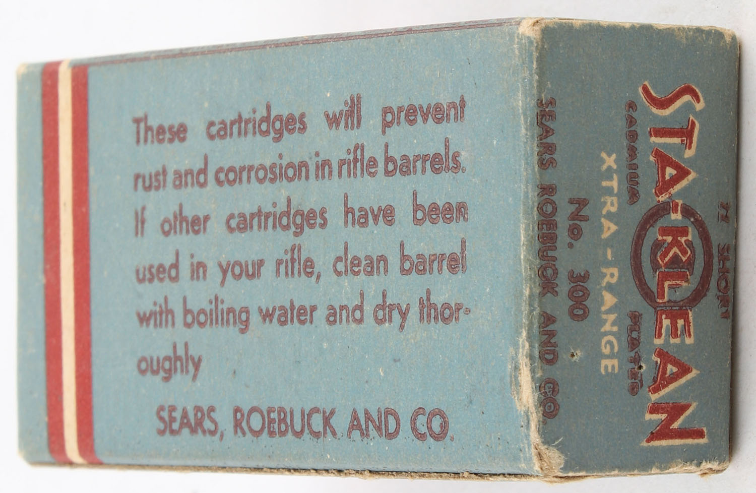 Sears, Sta-Klean, .22 Short, Cadmium Plated, RHWeb: SEARS-4 S-1b, Full, 1pc. Blue maroon & white box, box is solid with very good color, minor age soiling & color fading, very minor corner wear, edges are mostly crisp, end flaps are solid, ammo is excellent. Grade: Very Good + - Value: 10 to 15