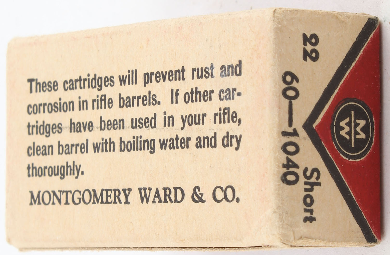 Wards, Cleanfire, .22 Short, Cadmium Plated, RHWeb: MW-3d S-3b1, Full, 1pc. Red white & black box, box is solid with excellent color, very minor corner wear, edges are crisp, end flaps are solid, ammo is excellent to minty. Grade: Excellent ++ - Value: 150 to 225