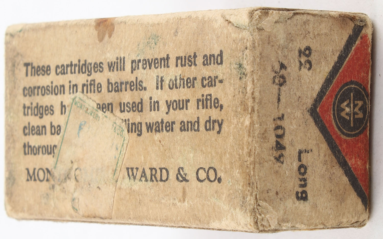 Wards, Cleanfire, .22 Long, Cadmium Plated, RHWeb: MW-3C L-7b, Partial 43rds., 1pc. Red white & black box, box is solid with fair color, age soiling, some staining & shelf wear, some edge & corner wear, end flaps are solid, ammo is very good. Grade: Fair ++ - Value: 20 to 30