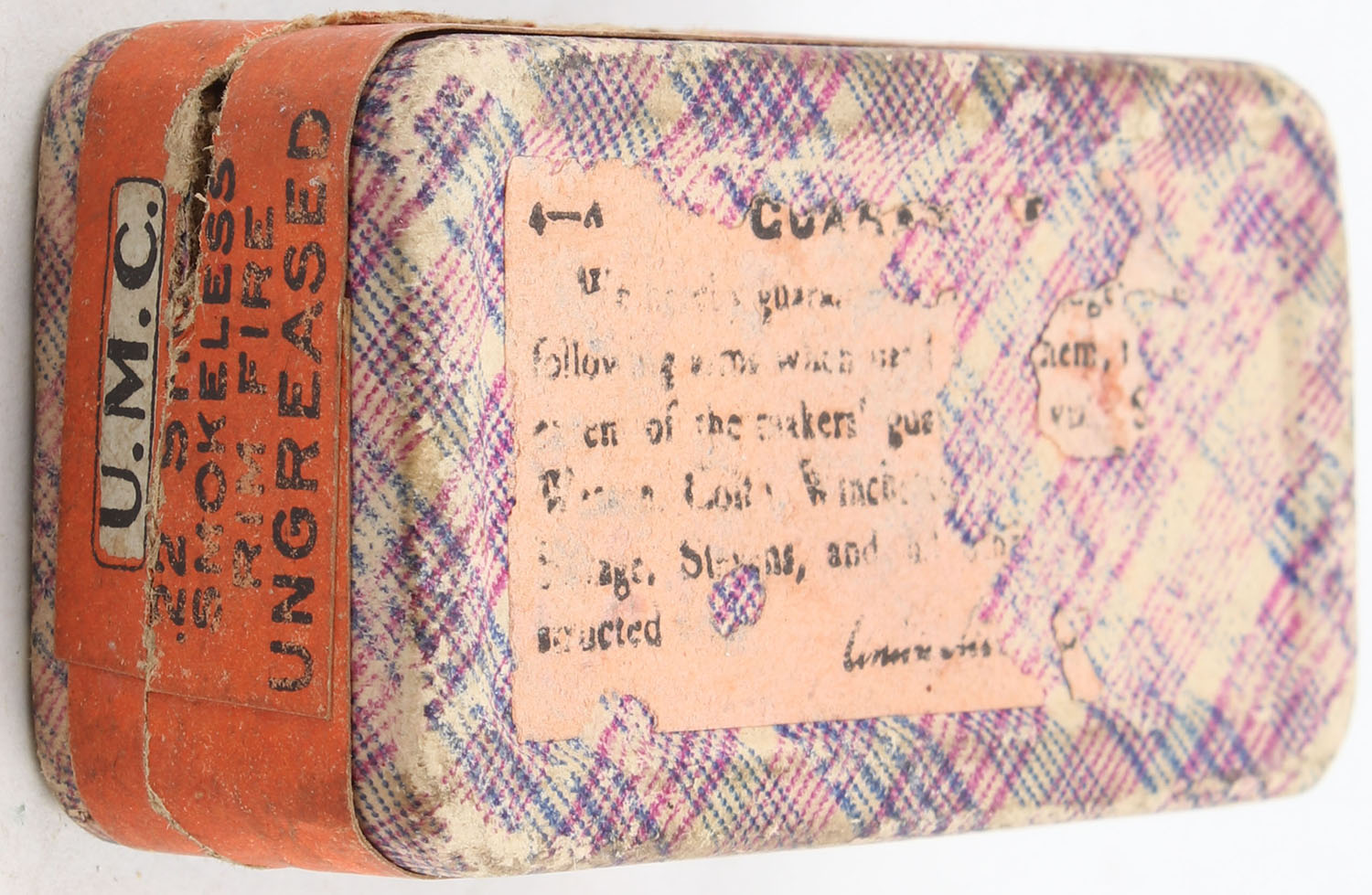 UMC, Rim Fire Cartridges, .22 Short, Smokeless, RHWeb: UMC-9.5 S-5, Full of what appears to be mixed ammo, 2pc. Purple fabric box with orange top & side sealing labels, box is solid with very good color, some age soiling & shelf wear, very minor edge & corner wear, labels are intact, ammo is very good to excellent. Grade: Very Good + - Value: 20 to 30