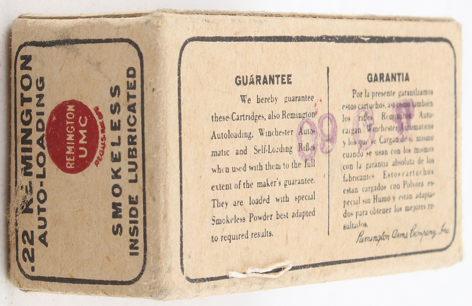 REM-UMC, Rim Fire Cartridges, .22 Remington Autoloading, RHWeb: REM-6 RA-1A, Full, 1pc. Buff black & red box, box is solid with excellent color, minor staining, very minor corner wear, edges are crisp, end flaps are solid, ammo is very good. Grade: Excellent - Value: 80 to 120