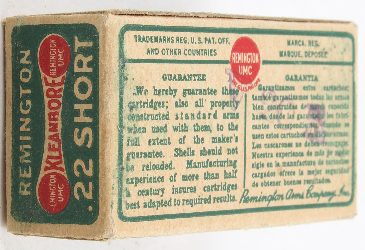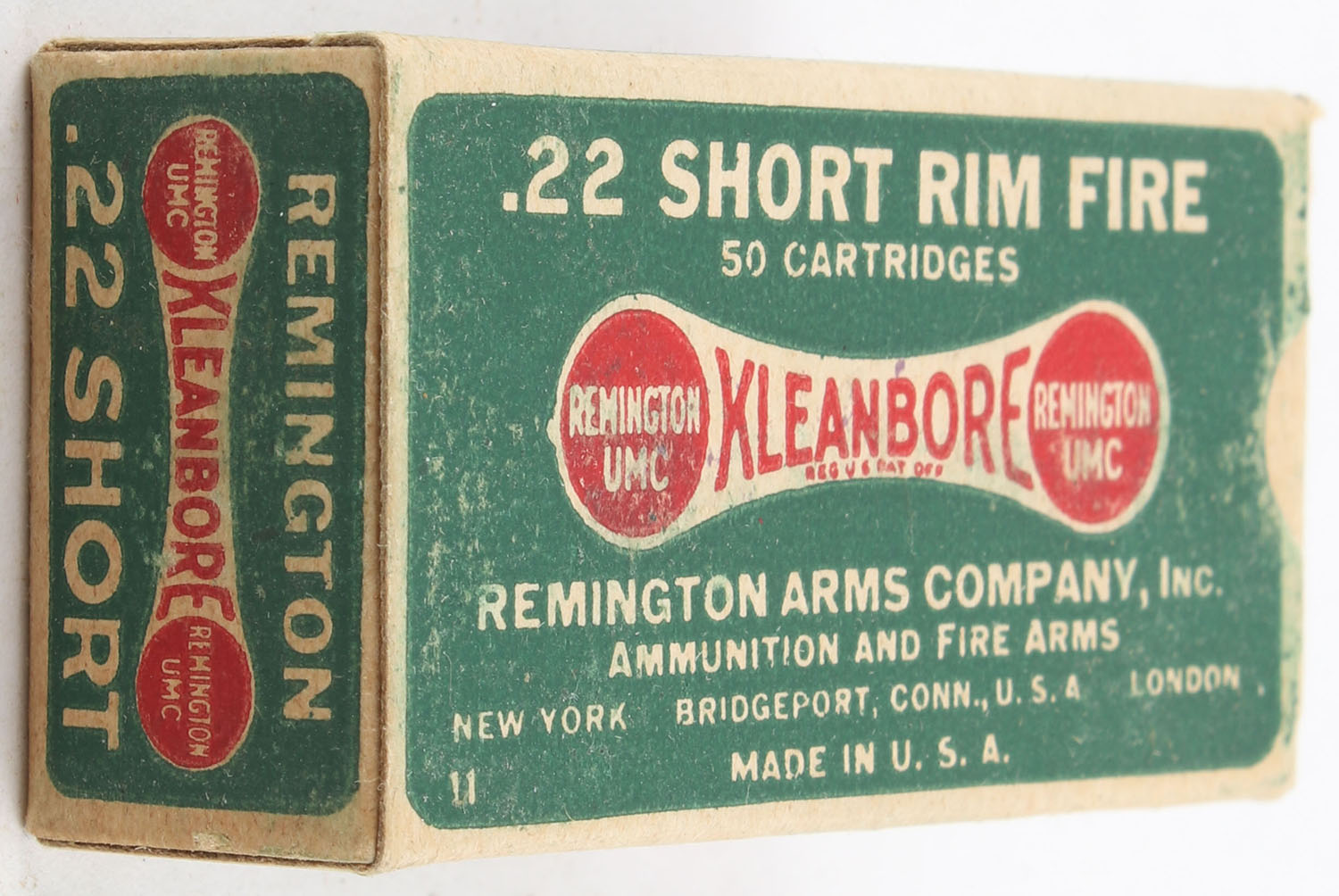 Remington, Kleanbore, .22 Short, RHWeb: REM-7.1A S-1a, Full, 1pc. Green buff & red dog bone box, box is solid with excellent color, minor shelf wear, corners are mostly sharp, edges are crisp, end flaps are solid, ammo is very good to excellent. Grade: Excellent - Value: 24 to 36