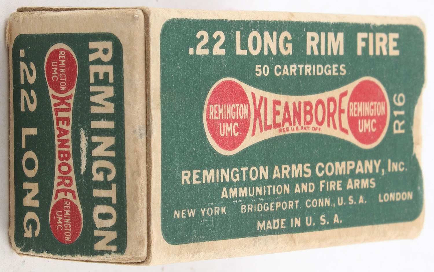 Remington, Kleanbore, .22 Long, RHWeb: REM-7.1B L-1d, Full, 1pc. Green buff & red dog bone box, box is solid with excellent color, very minor age soiling & corner wear, edges are crisp, end flaps are solid, ammo is excellent. Grade: Excellent - Value: 16 to 24