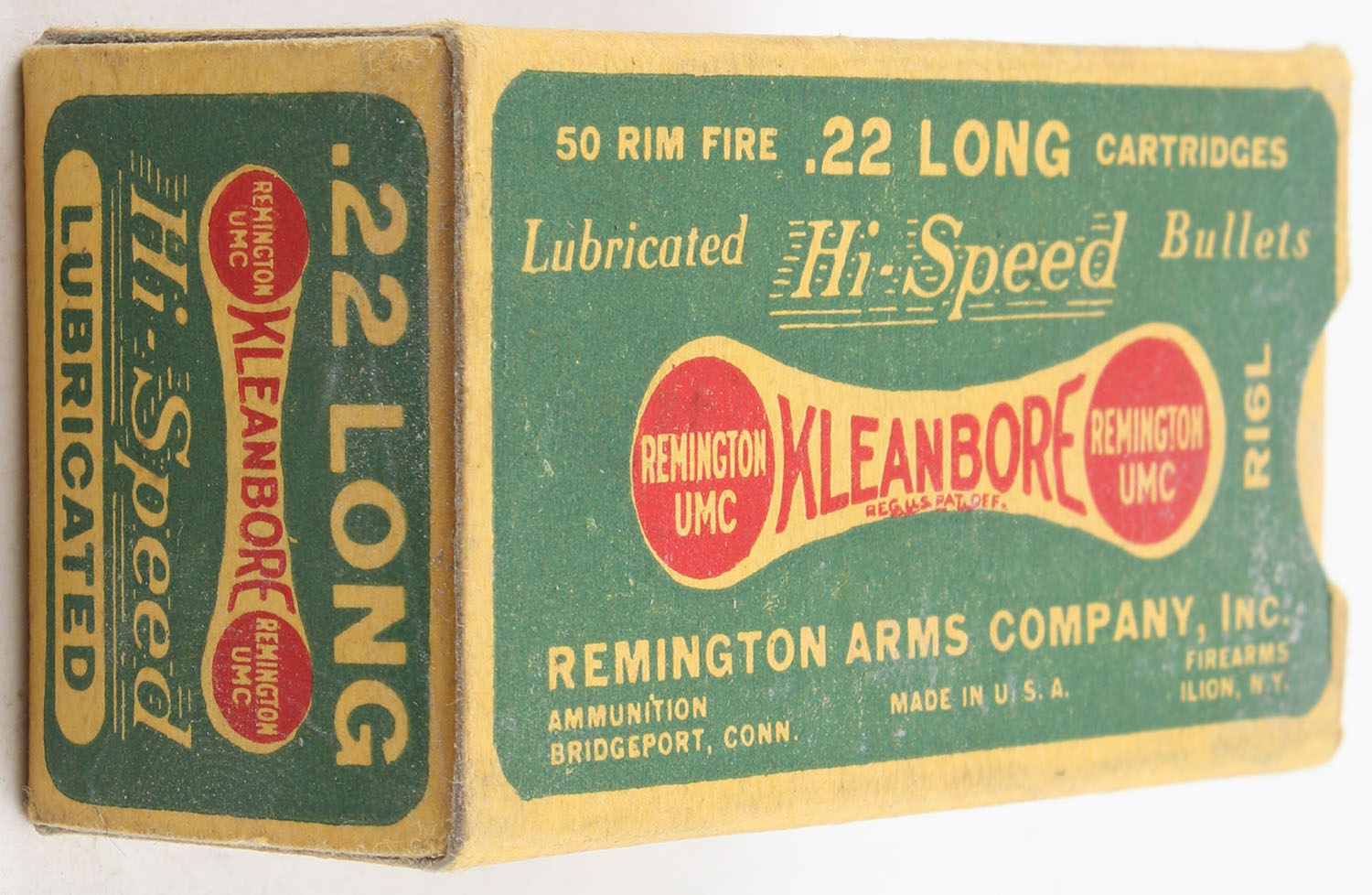 Remington, Kleanbore Hi-Speed, .22 Long, RHWeb: REM-7.4 L-1b, Full, 1pc. Green buff & red dog bone box, box is solid with excellent color, very minor corner wear, edges are crisp, end flaps are solid, ammo is good. Grade: Excellent - Value: 20 to 30