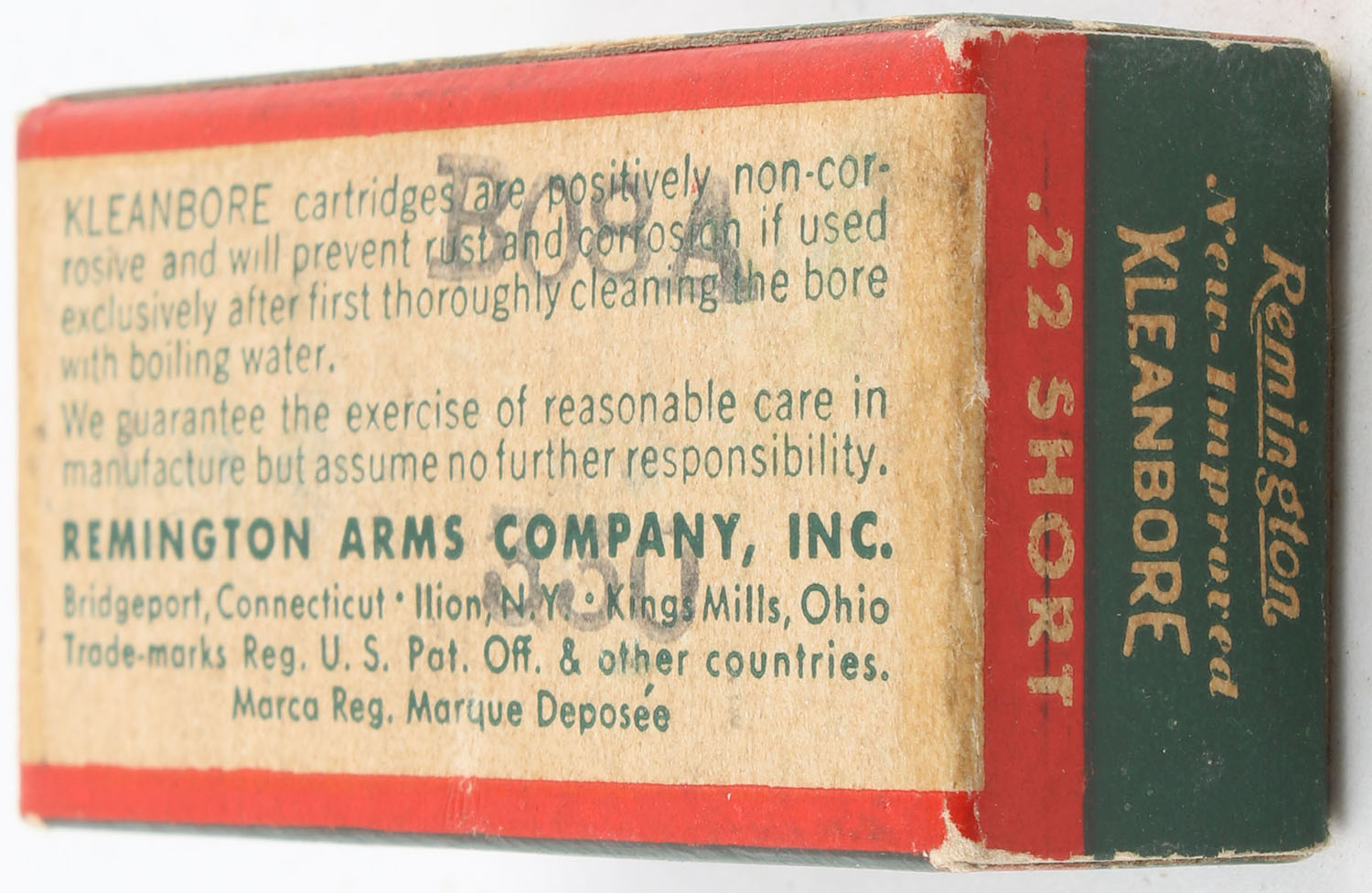 Remington, New and Improved Kleanbore, .22 Short, RHWeb: REM-11 S-1, Partial 38rds., 1pc. Green buff & red box, box is solid with excellent color, minor corner wear, edges are crisp, end flaps are solid, ammo is very good. Grade: Excellent - Value: 6 to 10