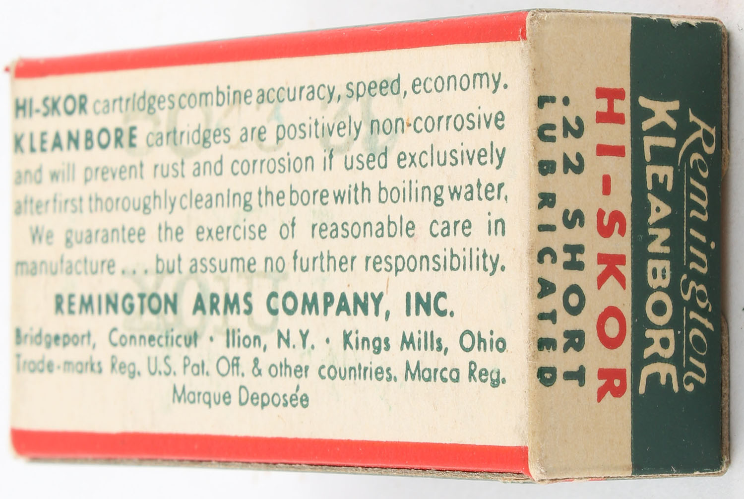 Remington, Hi-Skor, .22 Short, RHWeb: REM-53 S-1b, Full, 1pc. Green buff & red box, box is near mint with minty color, only very minor age soiling on bottom, corners are sharp, edges are crisp, end flaps are solid, ammo is excellent. Grade: Excellent ++ - Value: 30 to 45
