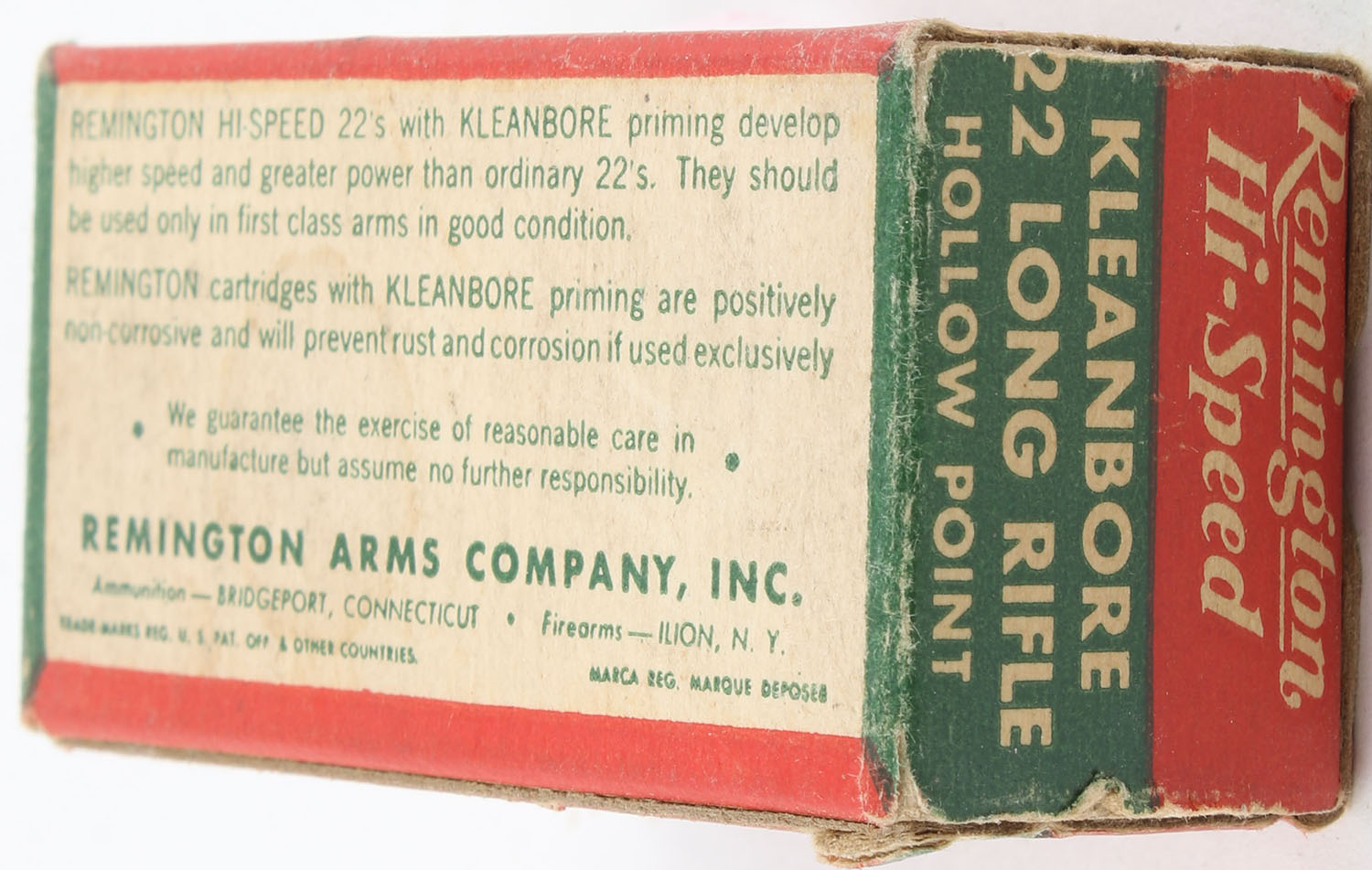 Remington, Hi-Speed Kleanbore, .22 Long Rifle Hollow Point, RHWeb: REM-14 LR-3c, Partial 45rds., 1pc. Red green & buff box, box is solid with excellent color, minor corner wear, edges are mostly crisp, end flaps are solid, ammo is excellent. Grade: Excellent - Value: 4 to 10