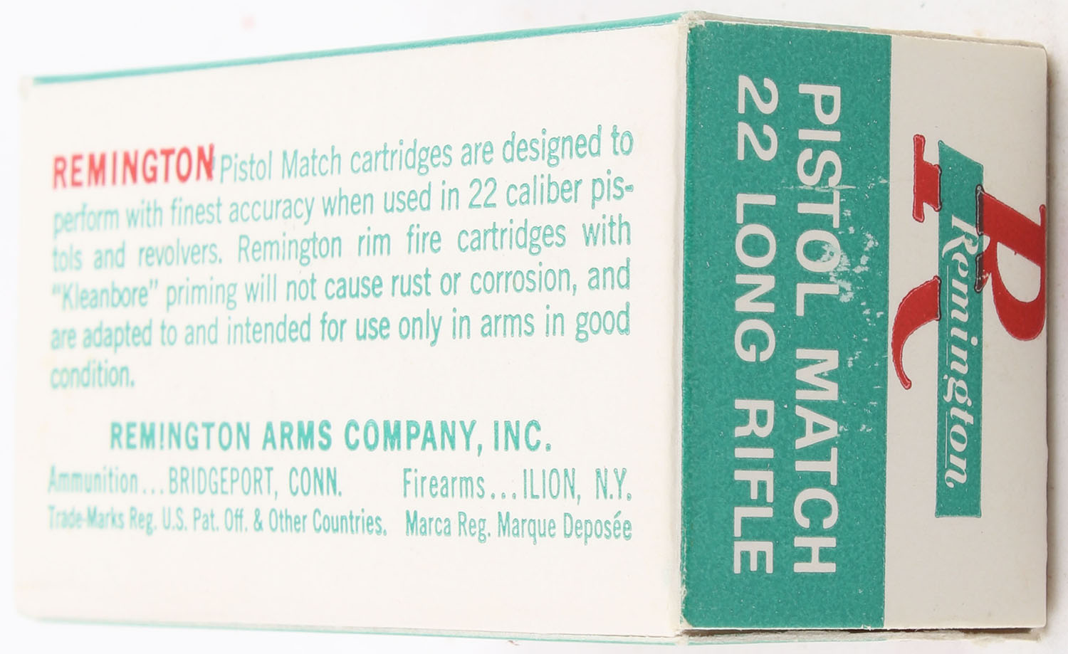 Remington, Pistol Match, .22 Long Rifle, RHWeb: REM-54 LR-11c, Full, 1pc. White green & red box, box is MINT with minty color, corners are sharp, edges are crisp, end flaps are solid, ammo is minty. Grade: MINT - Value: 6 to 10