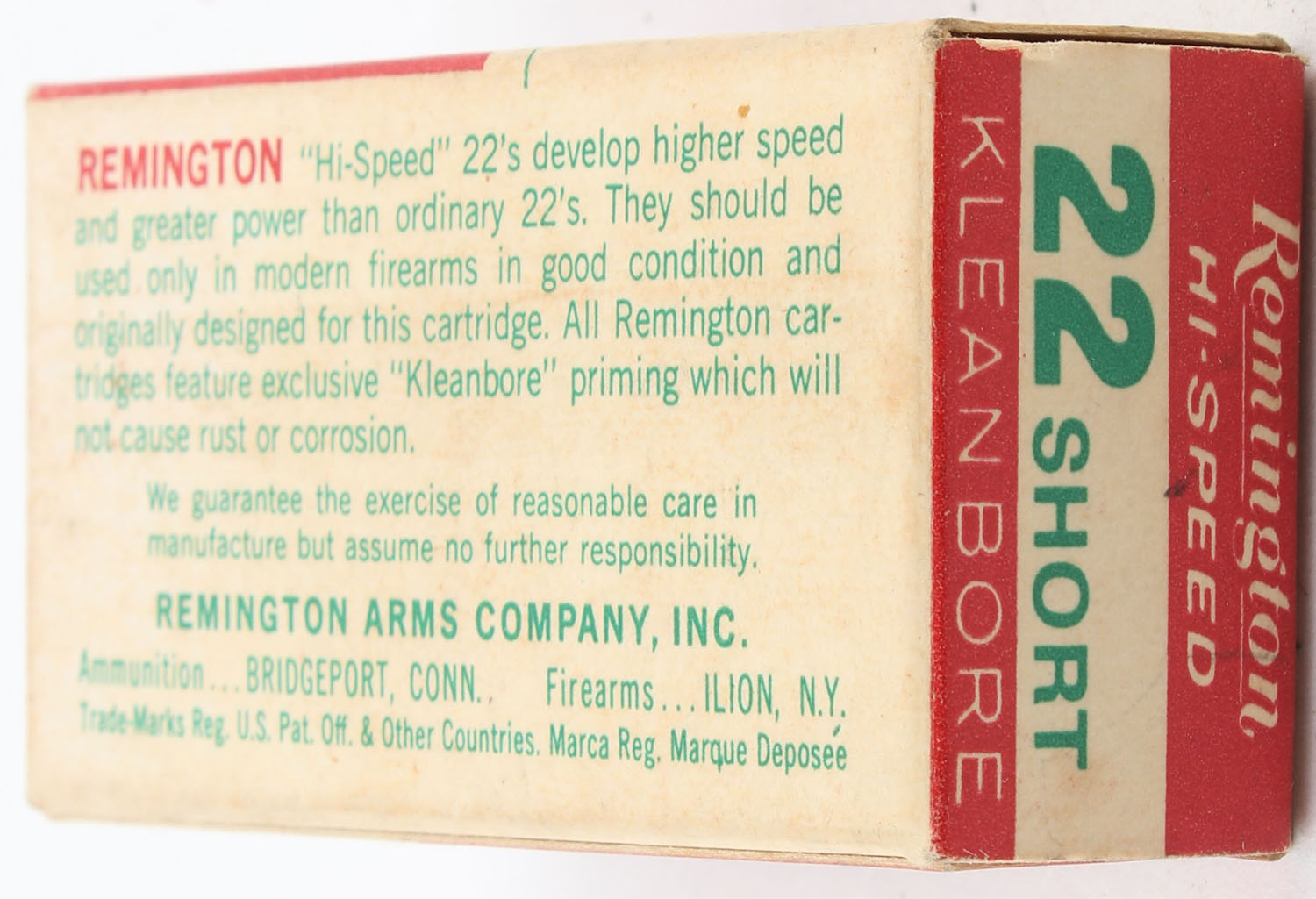 Remington, Hi-Speed, .22 Short, ''Golden'' Bullet, RHWeb: REM-17 S-2b, Full, 1pc. Red white & green box, box is solid with excellent color, very minor age soiling & corner wear, edges are crisp, end flaps are solid, ammo is excellent to minty. Grade: Excellent - Value: 10 to 15