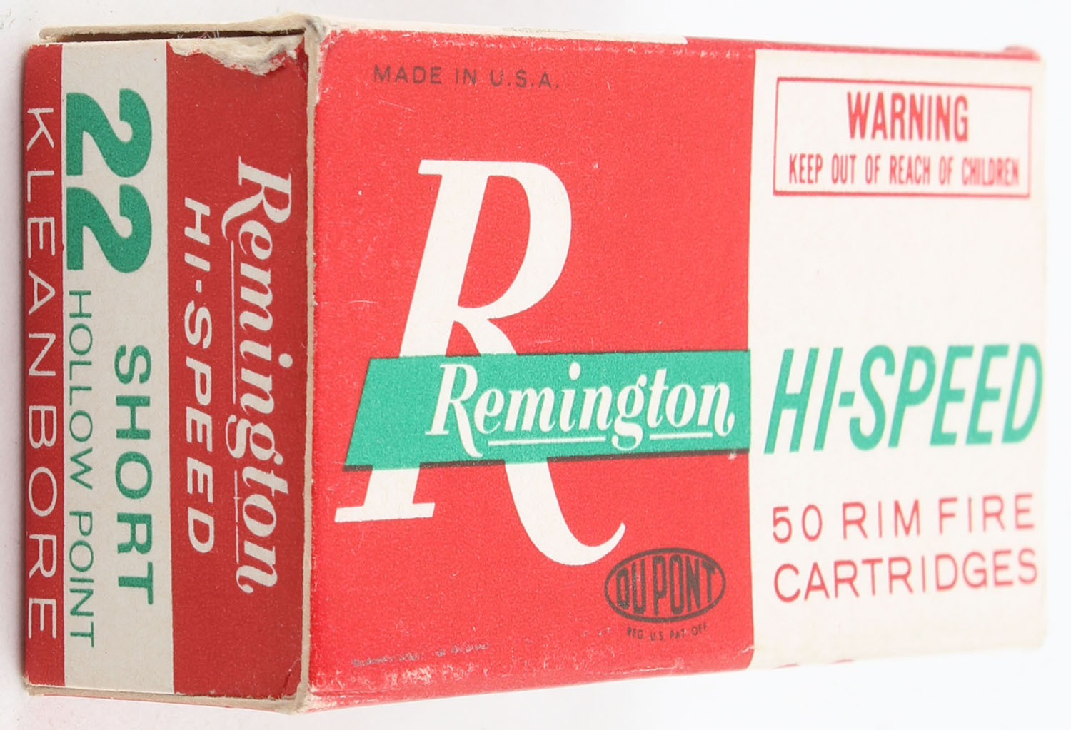 Remington, Hi-Speed, .22 Short Hollow Point, ''Golden'' Bullet, RHWeb: REM-17 S-3b, Full, 1pc. Red white & green box, box is near mint with minty color, only very minor corner wear, edges are crisp, end flaps are solid, ammo is minty. Grade: Excellent ++ - Value: 12 to 18