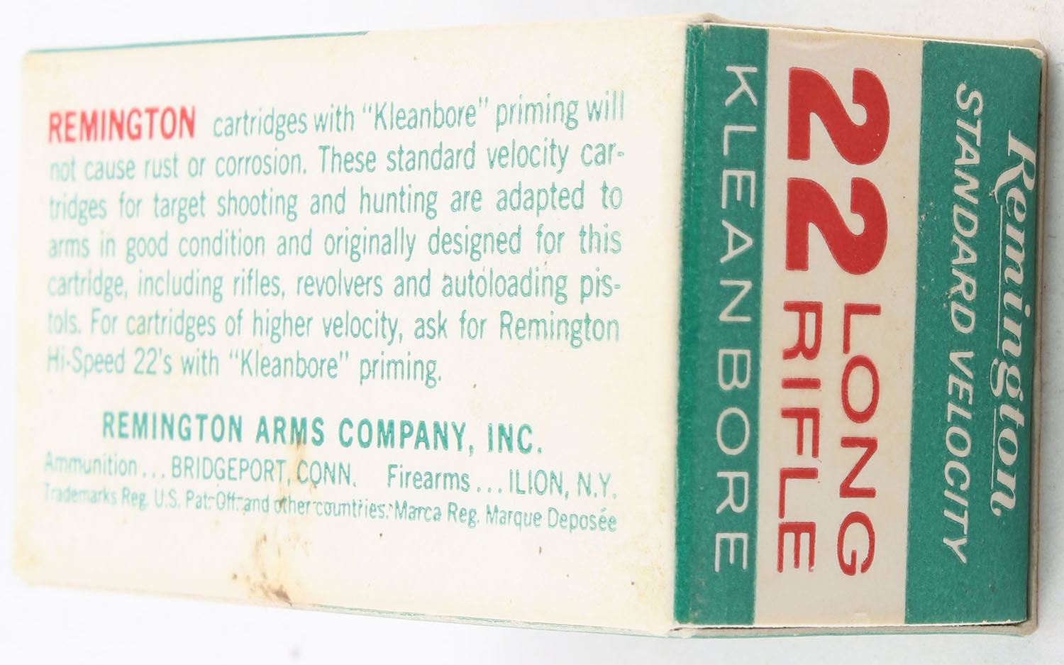 Remington, Standard Velocity, .22 Long Rifle, RHWeb: REM-17 LR-3a, Full, 1pc. Green white & red box, box is near mint with minty color, only very minor corner wear, edges are crisp, end flaps are solid, ammo is excellent. Grade: Excellent ++ - Value: 10 to 15