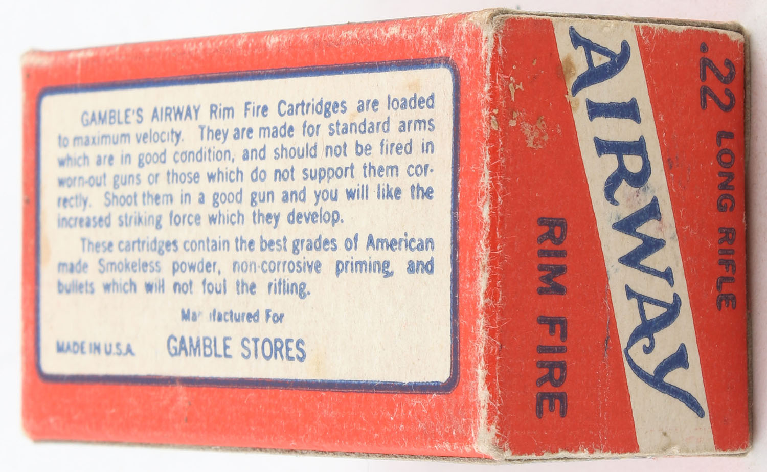 Gambles, Airway, .22 Long Rifle, RHWeb: GS-1 LR-1b, Full, 1pc. Red blue & white box, box is solid with excellent color, very minor edge & corner wear, end flaps are solid, ammo is excellent. Grade: Excellent - Value: 24 to 36